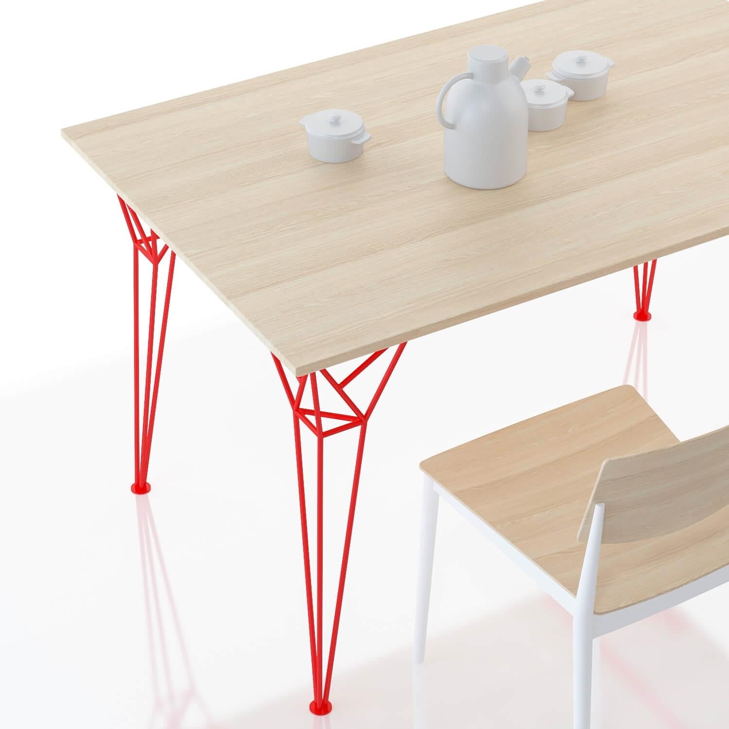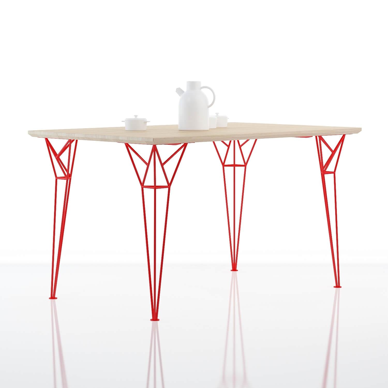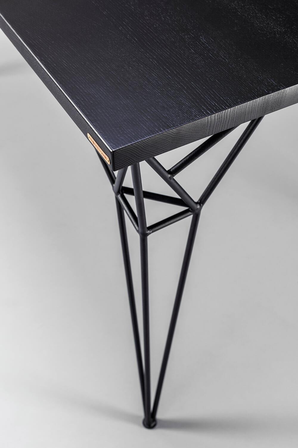 Каркас: прут (коло) сталевий 10 мм, лист сталевий, порошкове фарбування, накладки для захисту підлоги, латунний знак автентичності. Стільниця: масив ясена 40 мм (за запитом доступний дуб). Покриття: масло з твердим воском OSMO (Німеччина); поліуретанова емаль для дерева KEMICHAL (Італія). Поверхня: шовковисто-матова. Догляд: змахніть пил м'якою сухою тканиною або піпідастром. Будь-яку пролиту рідину потрібно відразу промокнути серветками.