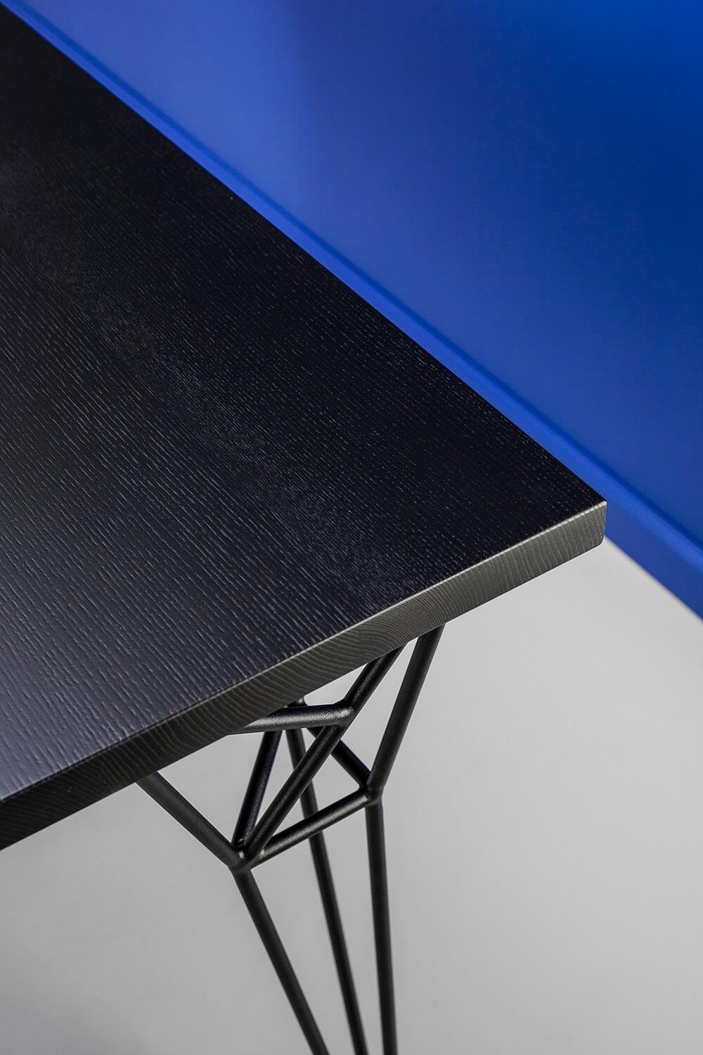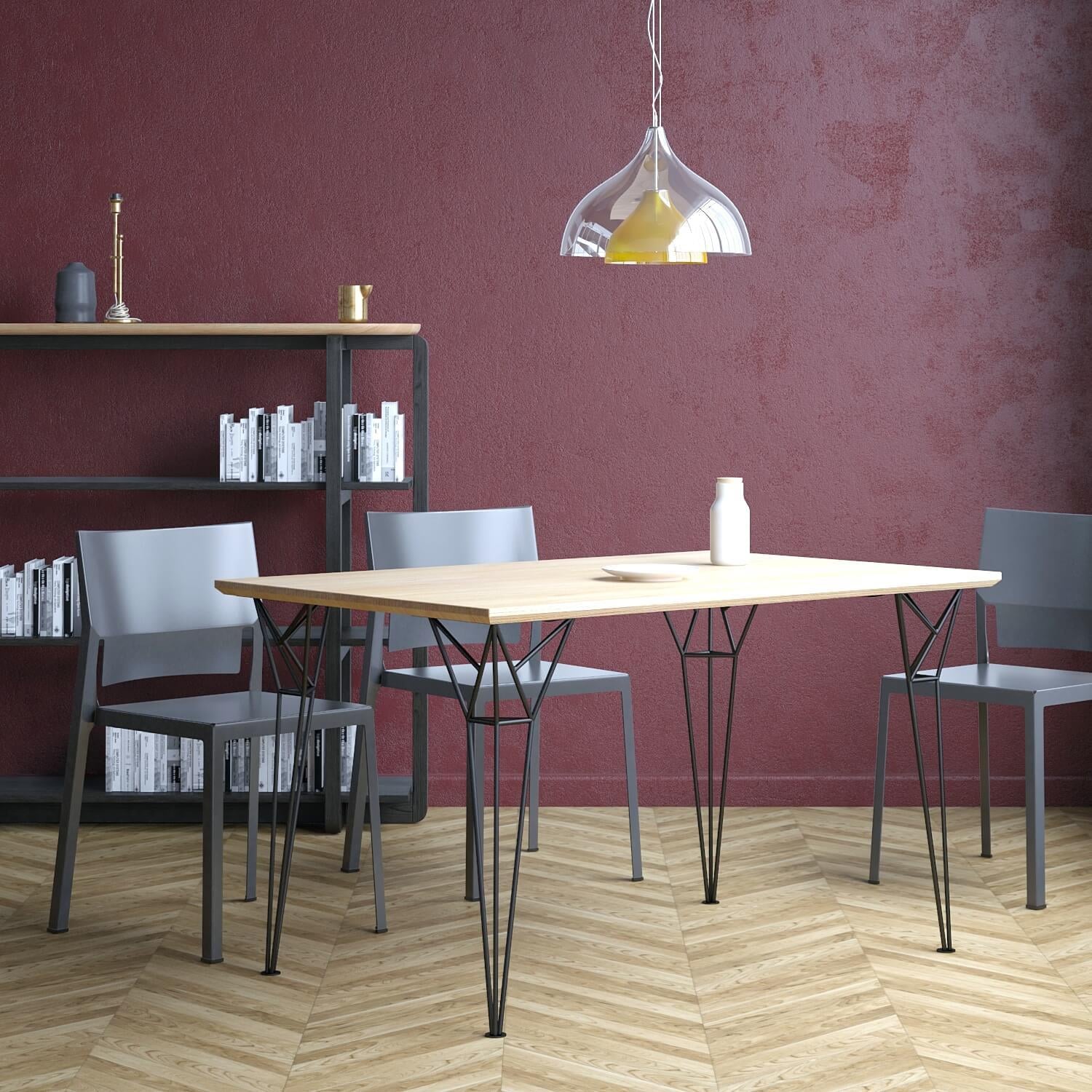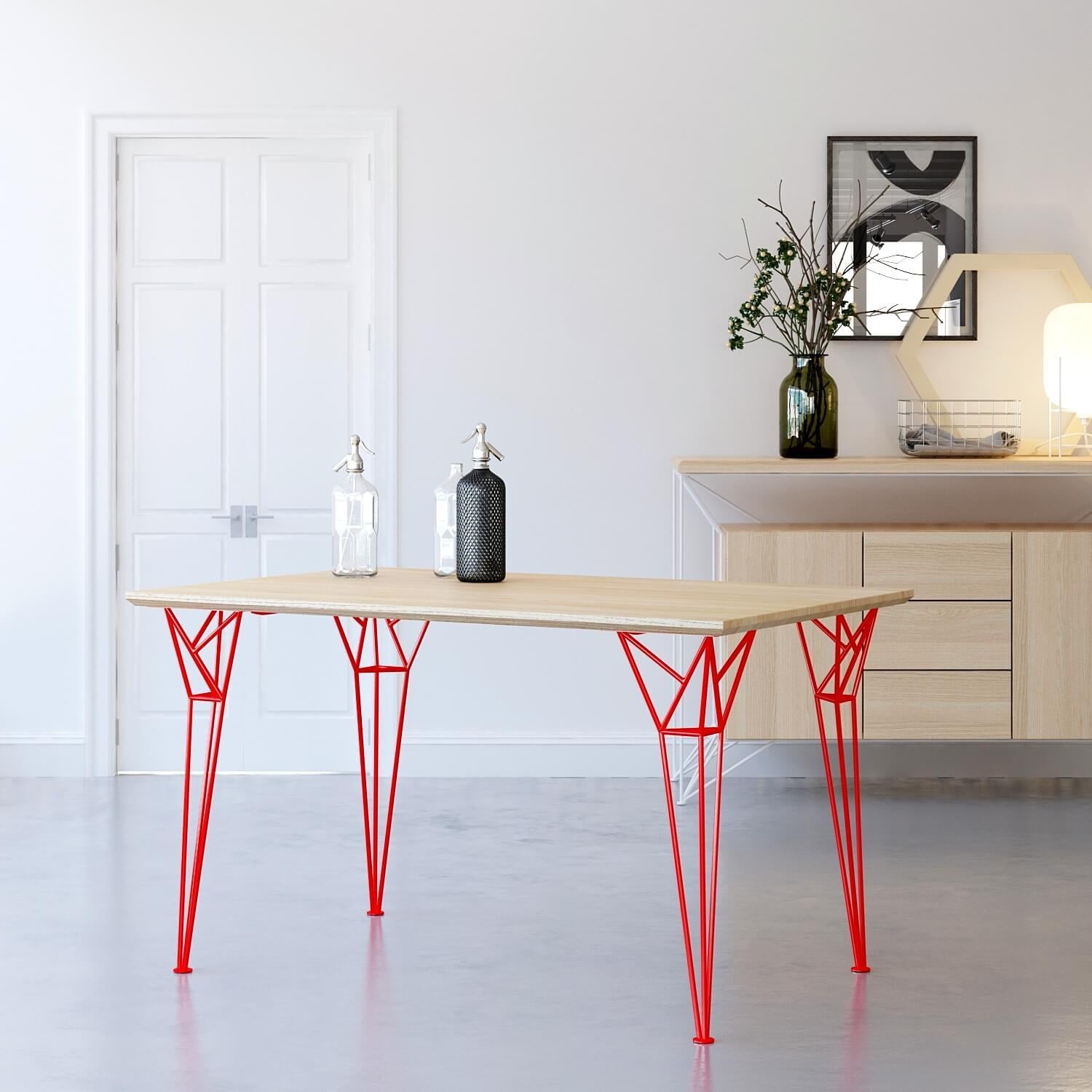 Каркас: прут (коло) сталевий 10 мм, лист сталевий, порошкове фарбування, накладки для захисту підлоги, латунний знак автентичності. Стільниця: масив ясена 40 мм (за запитом доступний дуб). Покриття: масло з твердим воском OSMO (Німеччина); поліуретанова емаль для дерева KEMICHAL (Італія). Поверхня: шовковисто-матова. Догляд: змахніть пил м'якою сухою тканиною або піпідастром. Будь-яку пролиту рідину потрібно відразу промокнути серветками.