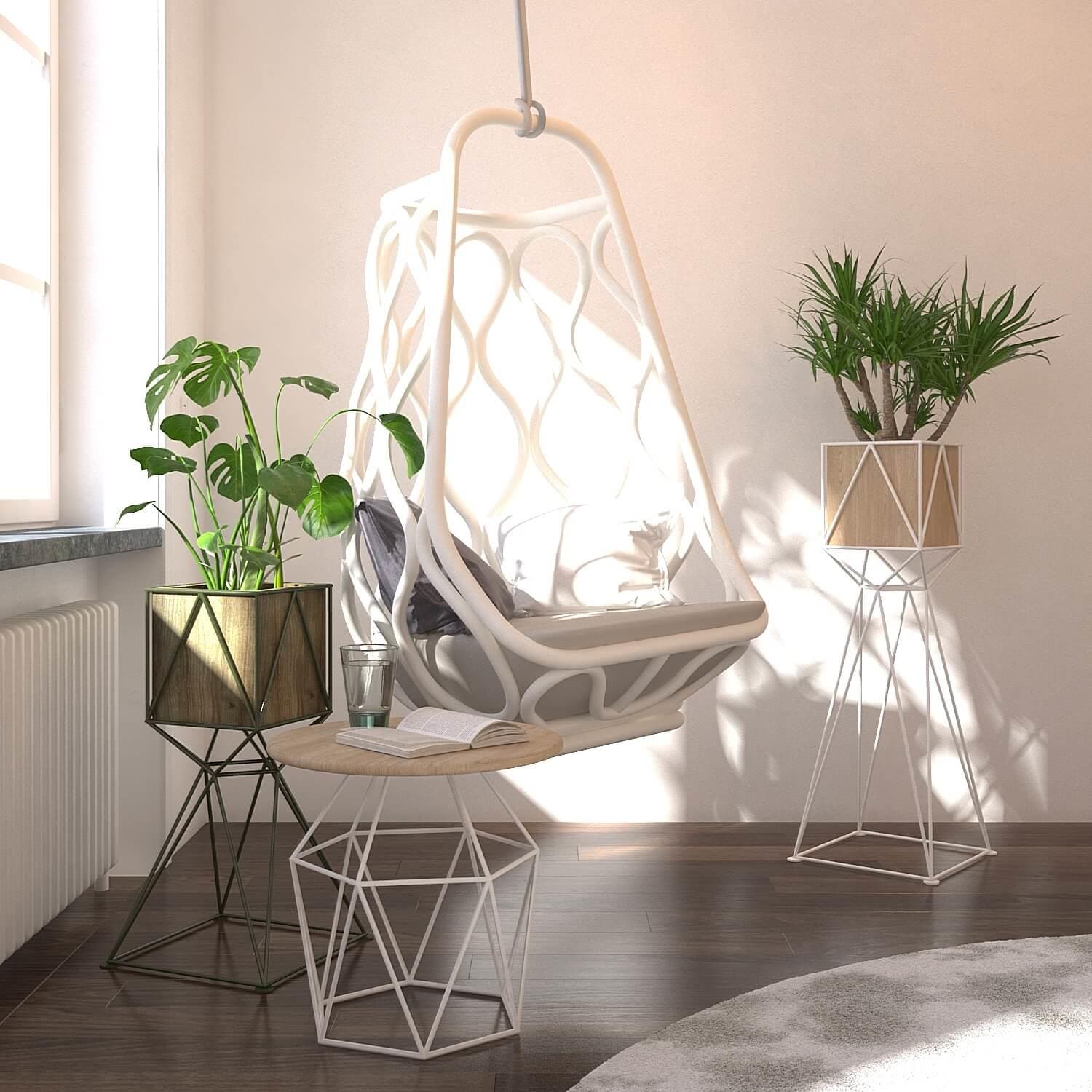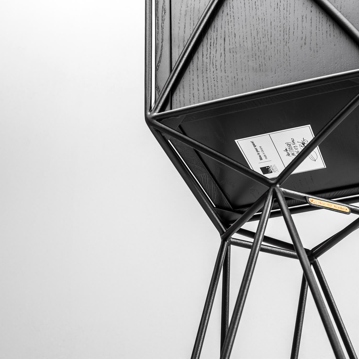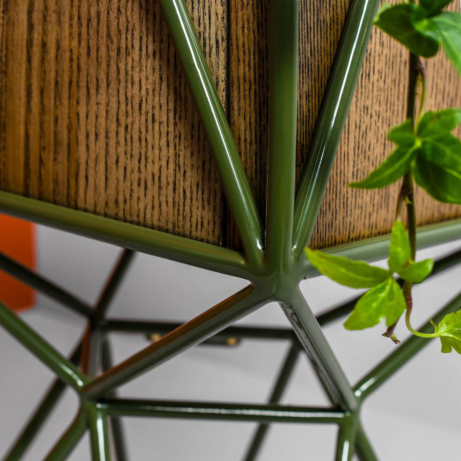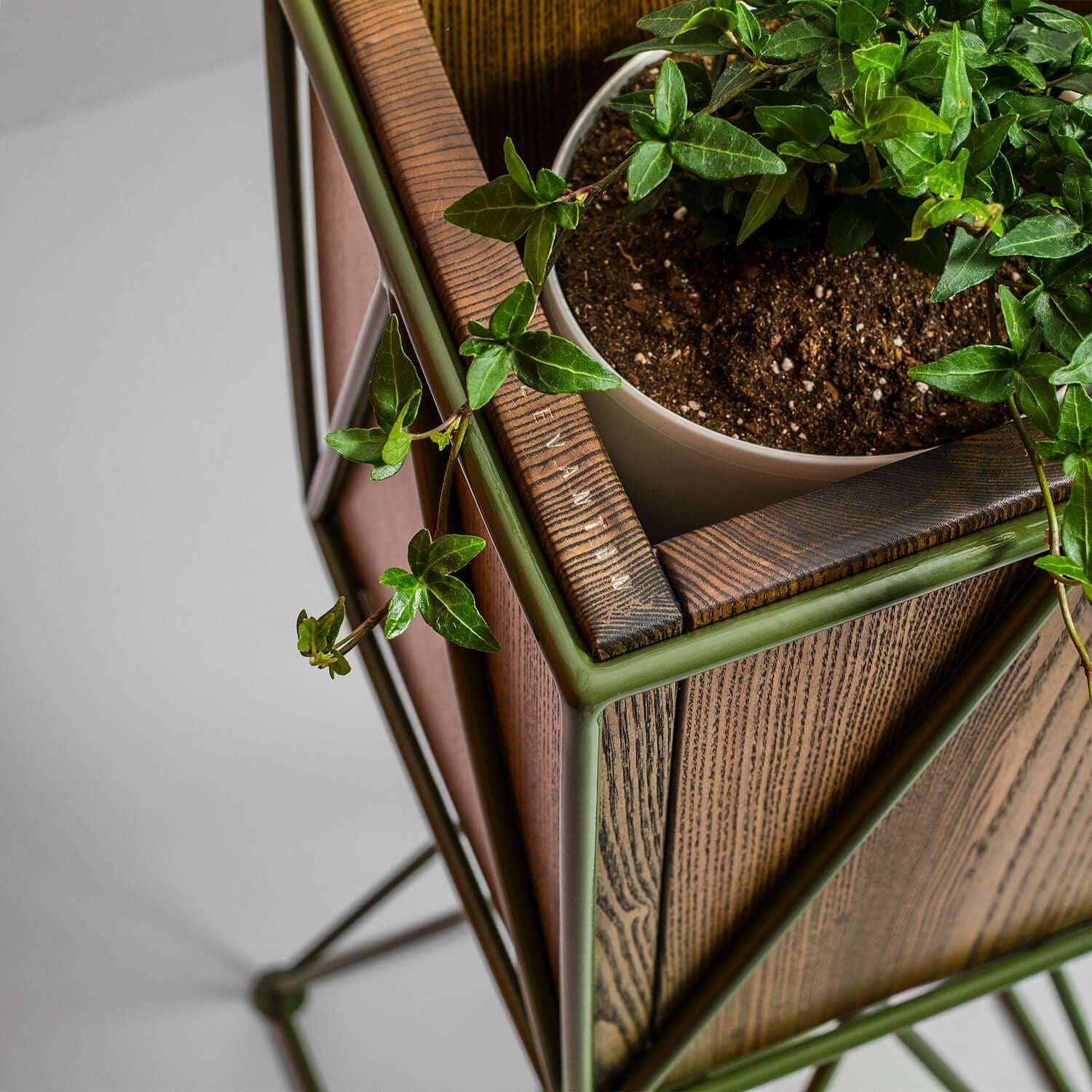 Каркас: прут (коло) сталевий 10 мм, порошкове фарбування, накладки для захисту підлоги, латунний знак автентичності. Кадка: масив ясена 20 мм. Покриття: масло з твердим воском OSMO (Німеччина); поліуретанова емаль для дерева KEMICHAL (Італія). Догляд: Розміщуйте рослину у власному горщику з потрібним дренажем, відкритий вологий грунт може деформувати поверхню.