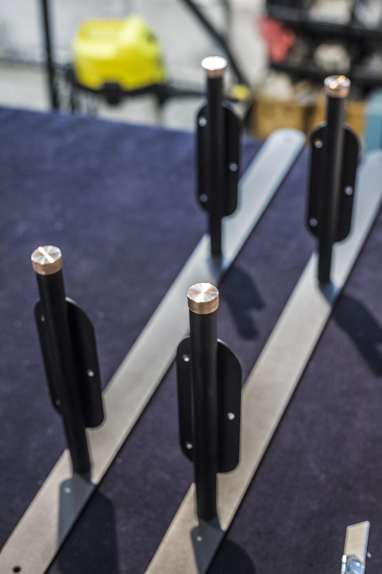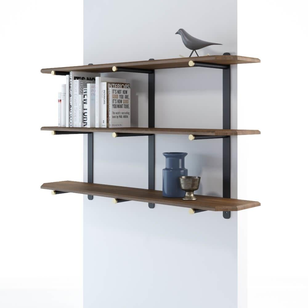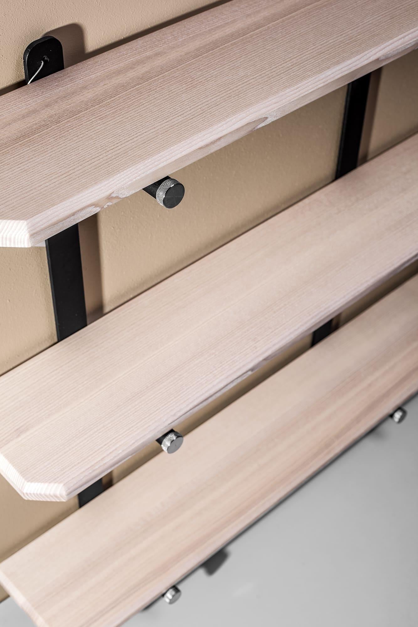 Яскравою особливістю поличок є акцентні латунні закінчення. У поєднанні з темною дерев'яною поверхнею, вони створюють відчуття блискучих ґудзиків на японській шкільній формі для хлопчиків - гакуран. Як ще одне відсилання до освіти і до того, що часи суворої шкільної дисципліни для вас уже минули. Tsunde будуть доречні в різних домашніх зонах: коридорі, передпокої, вітальні, спальні або кухні. Потужні кронштейни зі сталевого листа і труби, створюють міцну систему, що кріпиться до стіни. Це дає змогу скласти підвісні книжкові шафи в громадських просторах і освітніх центрах.