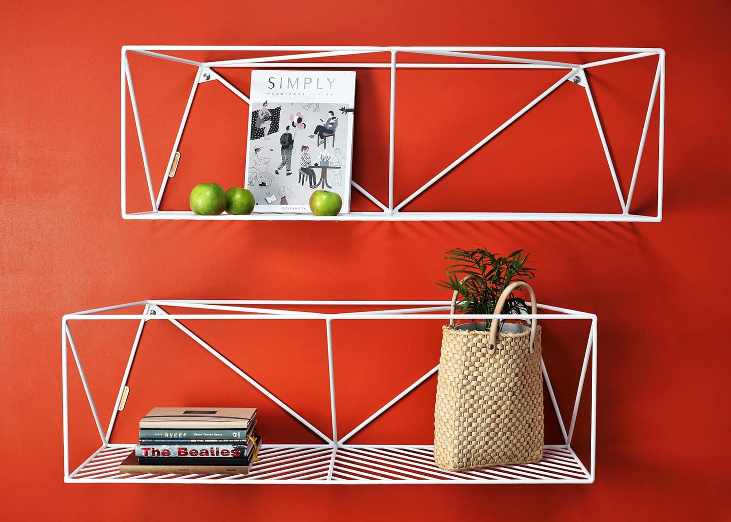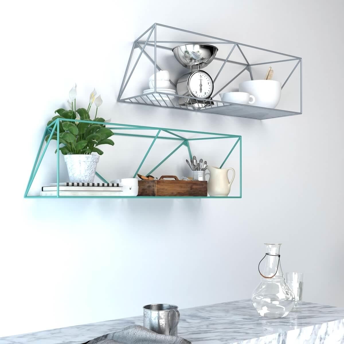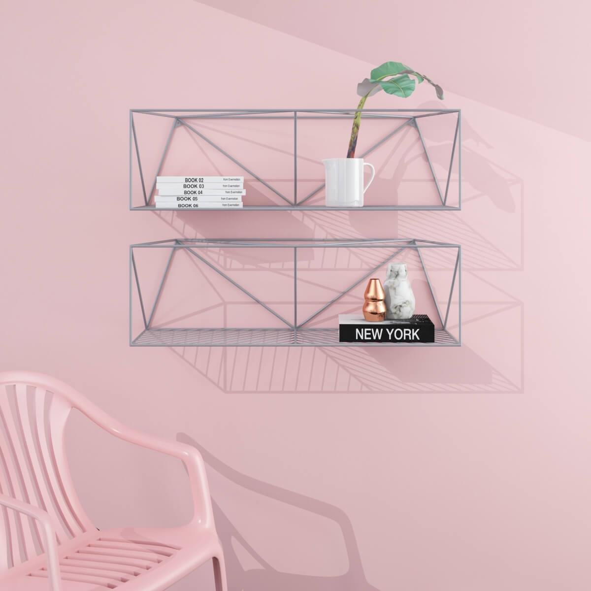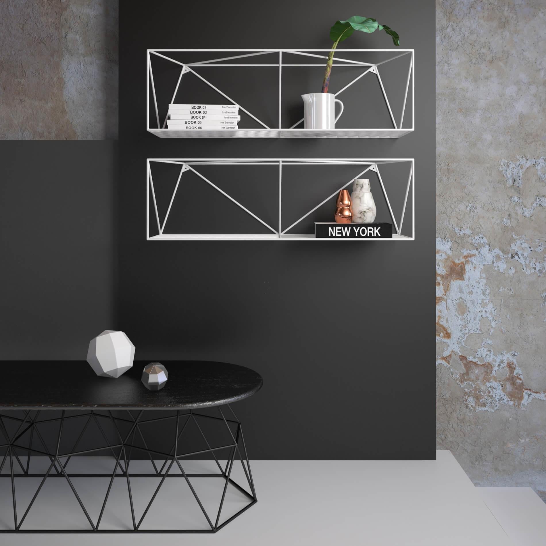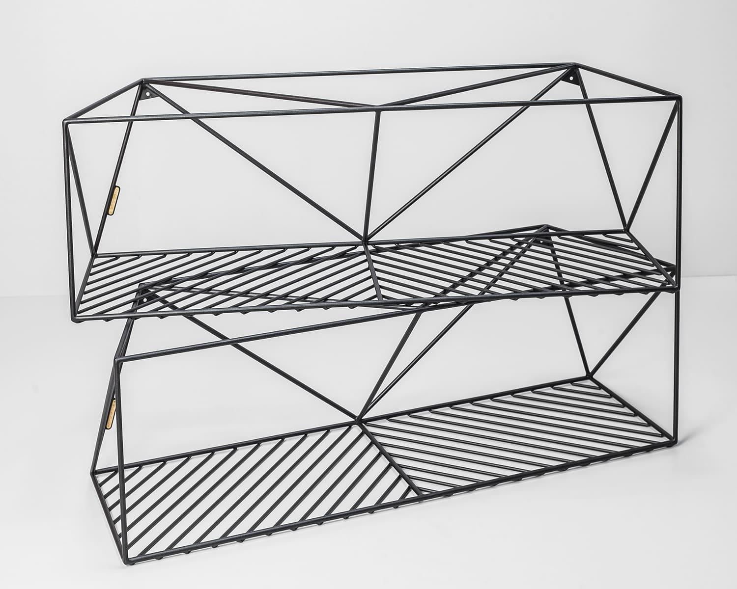 Настінні полиці Uklad являють собою вигадливу систему зберігання, що легко кріпиться до стіни. Металеві стрижні спрямовуються з кутів, утворюючи динамічний потік ліній, міцний для навантажень. У комплект входять 2 одиниці.