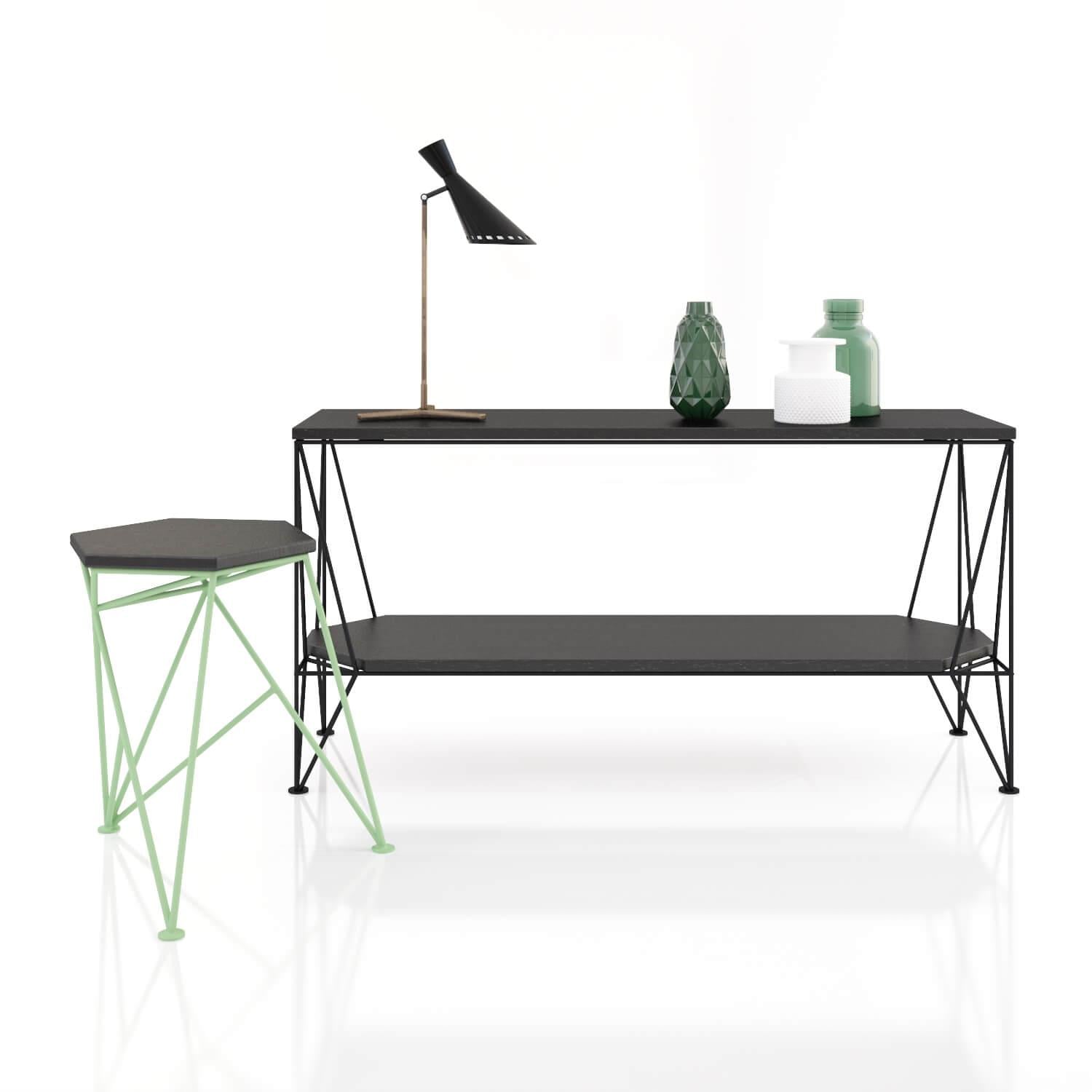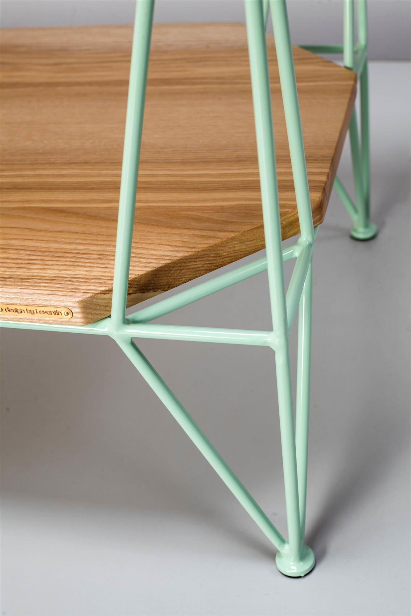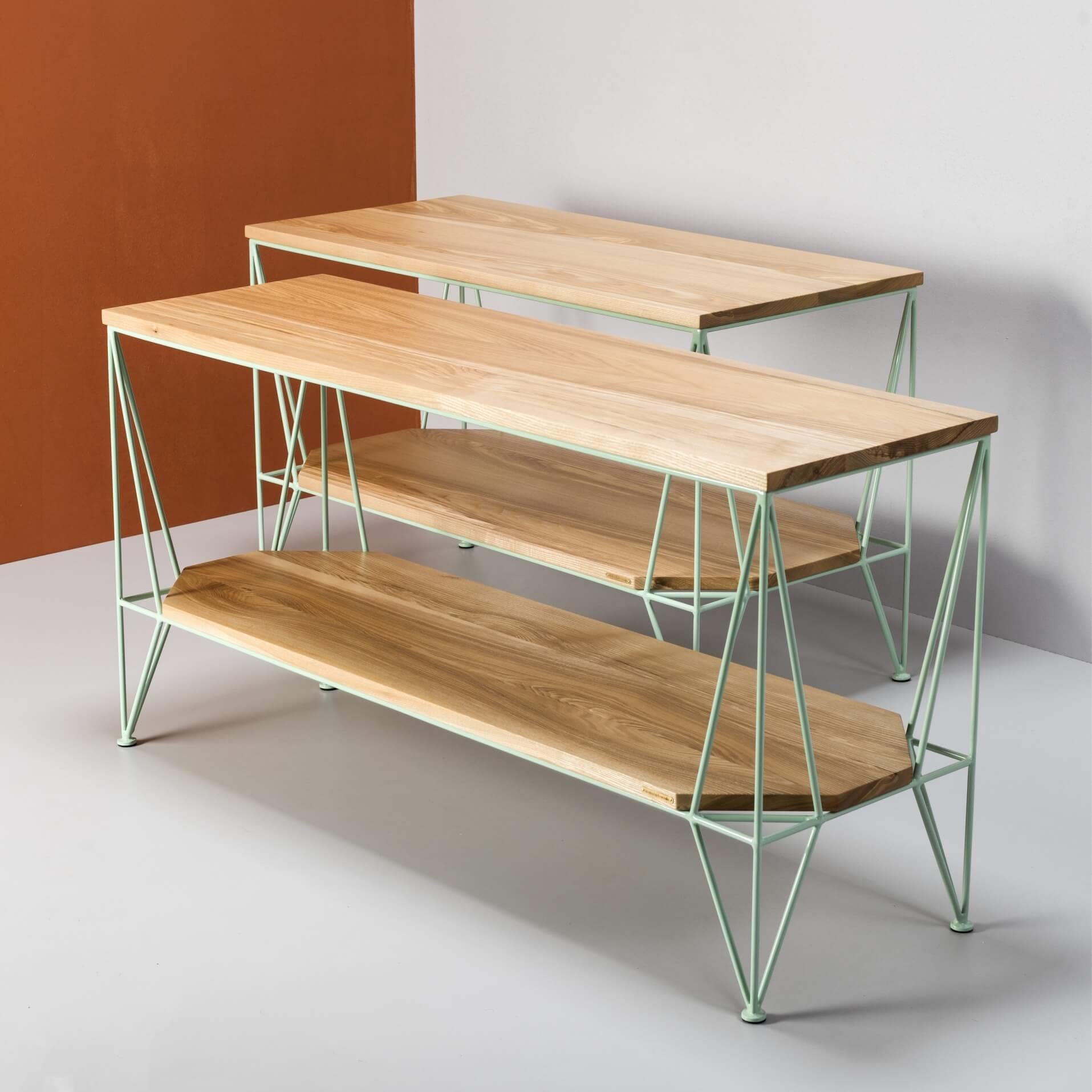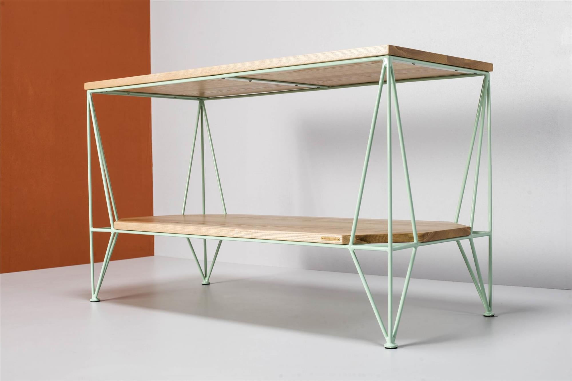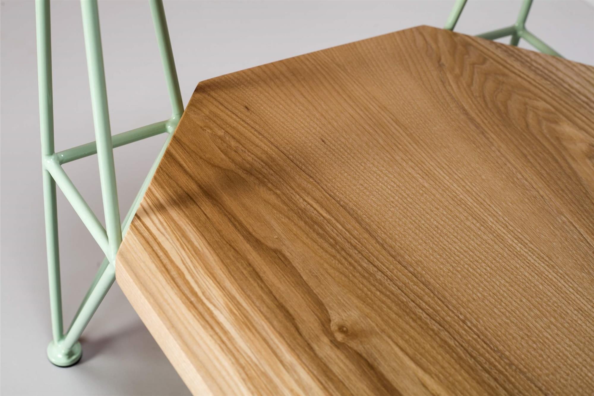 Каркас: прут (коло) сталевий 10 мм, порошкове фарбування, накладки для захисту підлоги, латунний знак автентичності. Стільниця: масив ясена 20 мм (за запитом доступний дуб). Покриття: масло з твердим воском OSMO (Німеччина); поліуретанова емаль для дерева KEMICHAL (Італія). Поверхня: шовковисто-матова. Догляд: змахніть пил м'якою сухою тканиною або піпідастром. Будь-яку пролиту рідину потрібно відразу промокнути серветками.