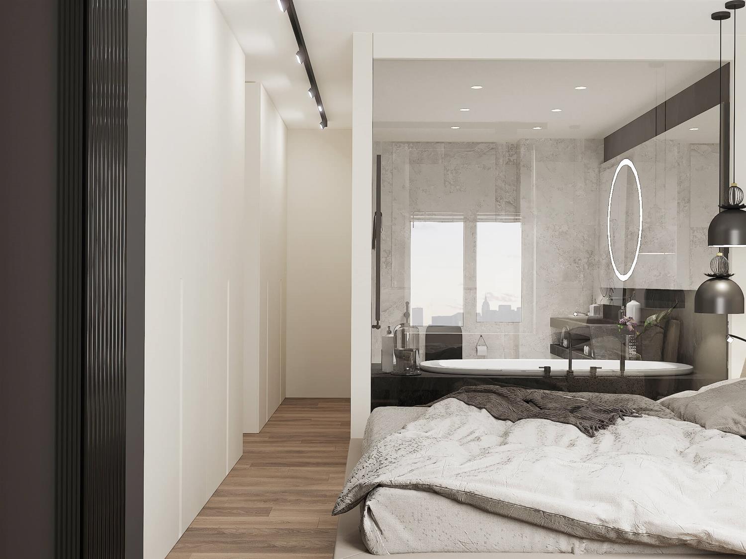 Проект интерьера от Chri.eitor.studio, с уютной светлой спальней, совмещенной с ванной комнатой и нашими подвесными лампами Mistress.