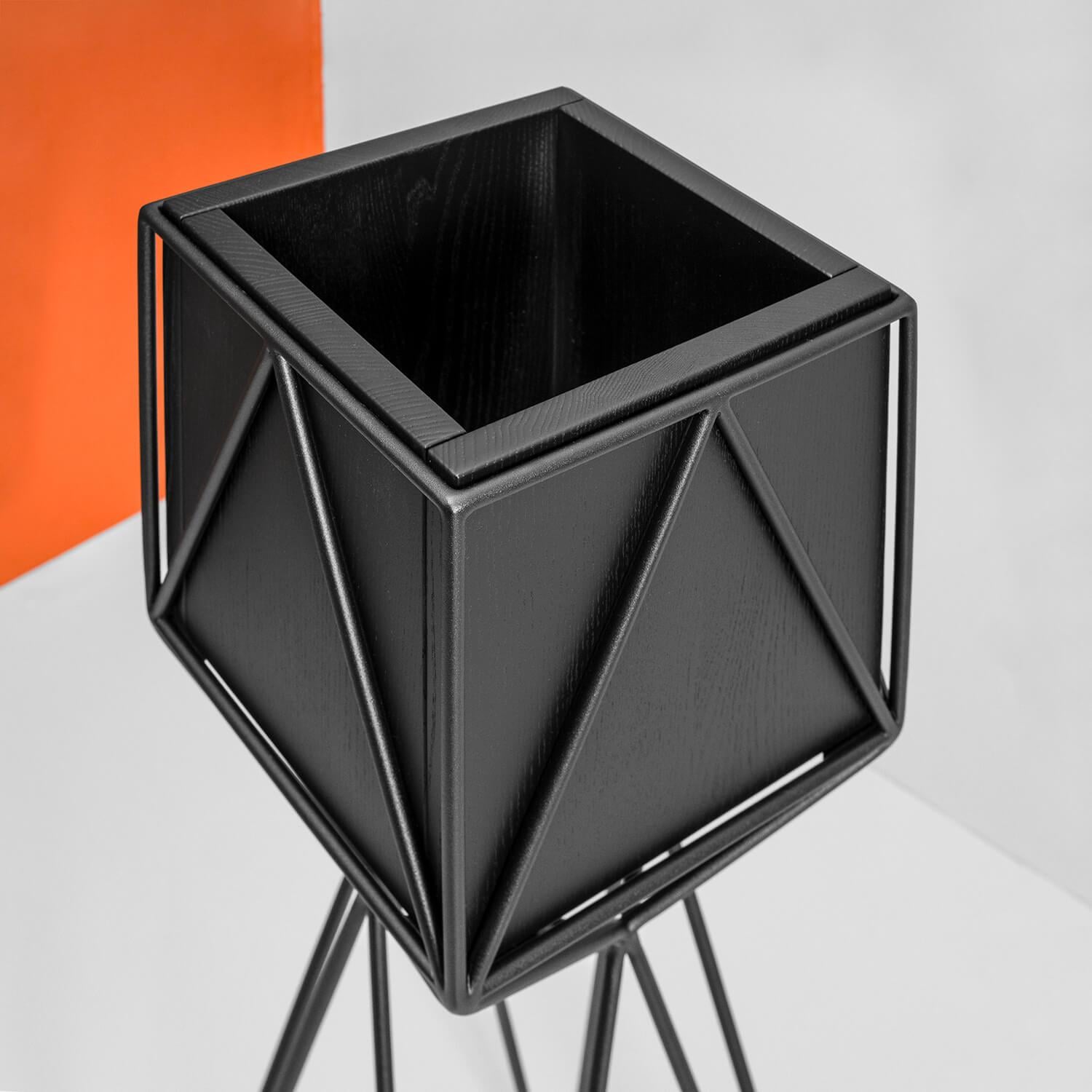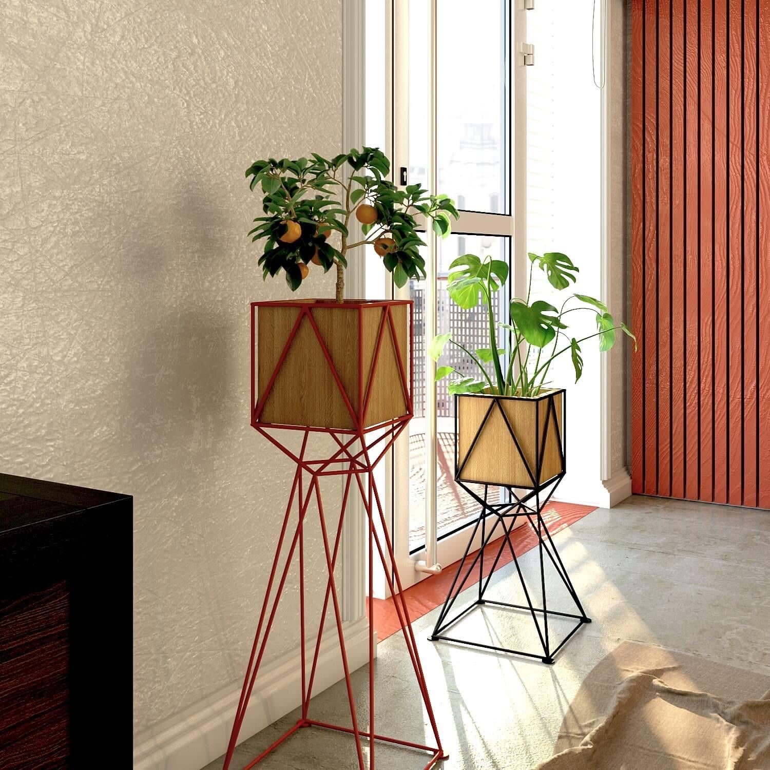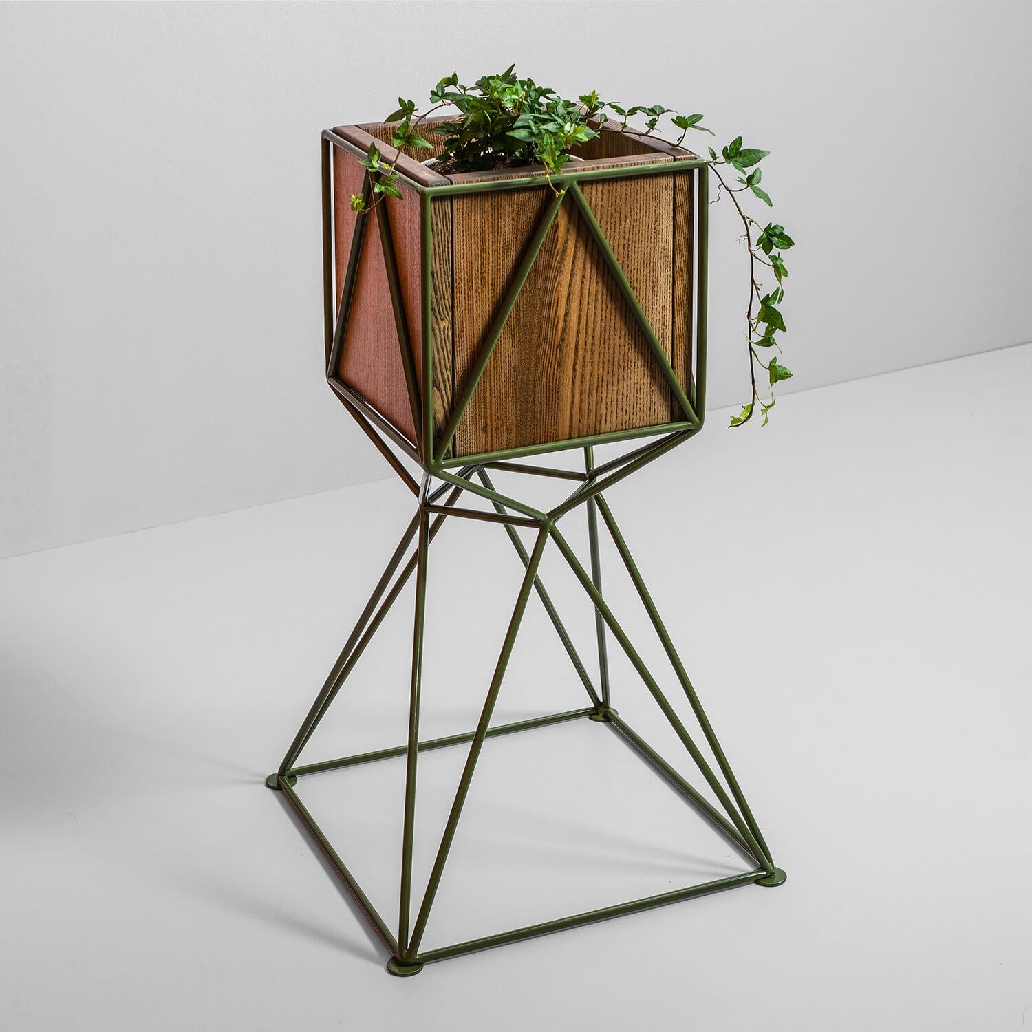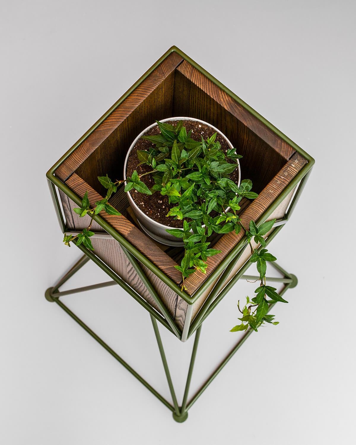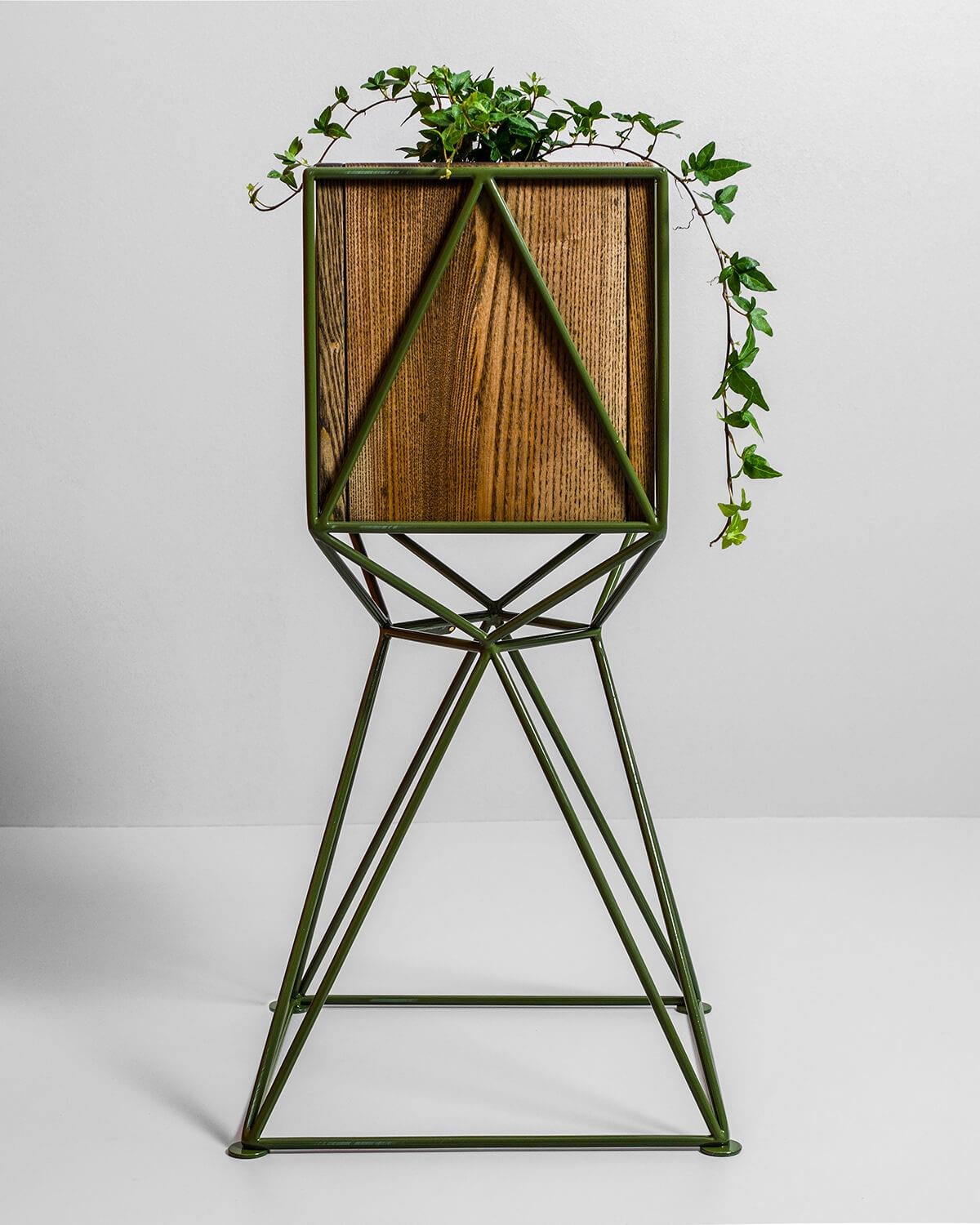 Каркас: стальной стержень 10 мм, порошковая покраска, войлочные накладки для защиты пола, латунный знак подлинности. Кадка: массив ясеня 20 мм. Уход: размещайте растение в собственном горшке с нужным дренажем, открытый влажный грунт может деформировать поверхность.