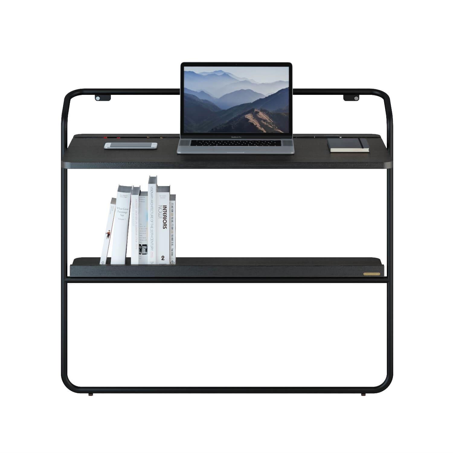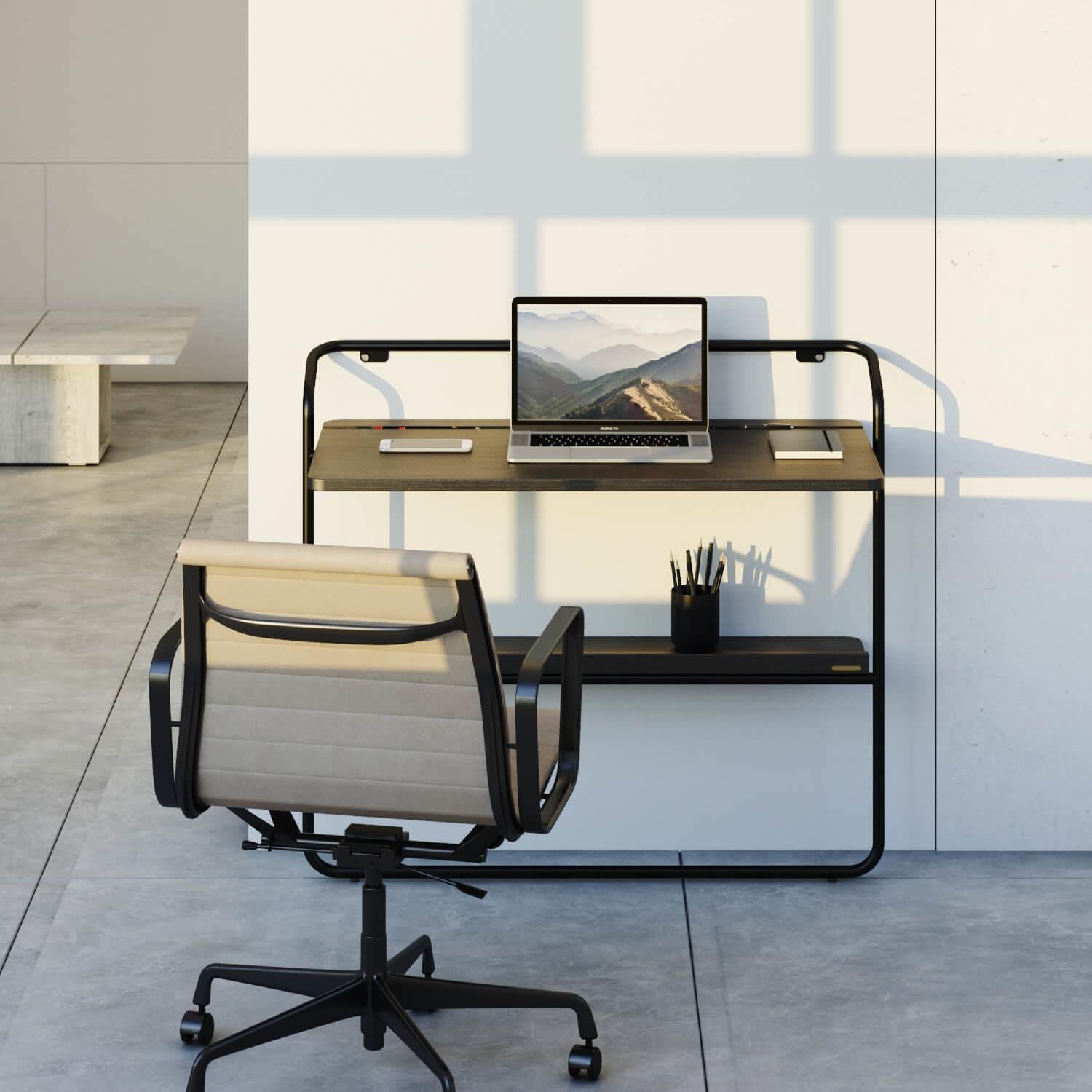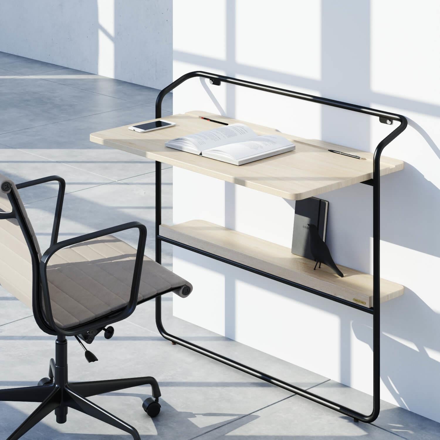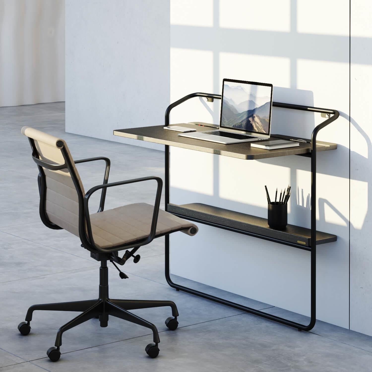 Дизайн стола обыгрывает нежный минимализм, сочетая изогнутые линии, закругленные края, и тактильно приятную столешницу из натуральной древесины ясеня. Его привлекательность особенно подчеркивается роскошной черной отделкой. Она проявляет естественную текстуру, окутывая рабочее место ореолом таинственности. Прочный и портативный стол способен адаптироваться к любым интерьерам, особенно с ограниченным пространством. Снизу у стены расположена полочка для подручных мелочей. При использовании стола Cercano в качестве будуарного, она может стать местом хранения декоративной косметики и средств ухода.