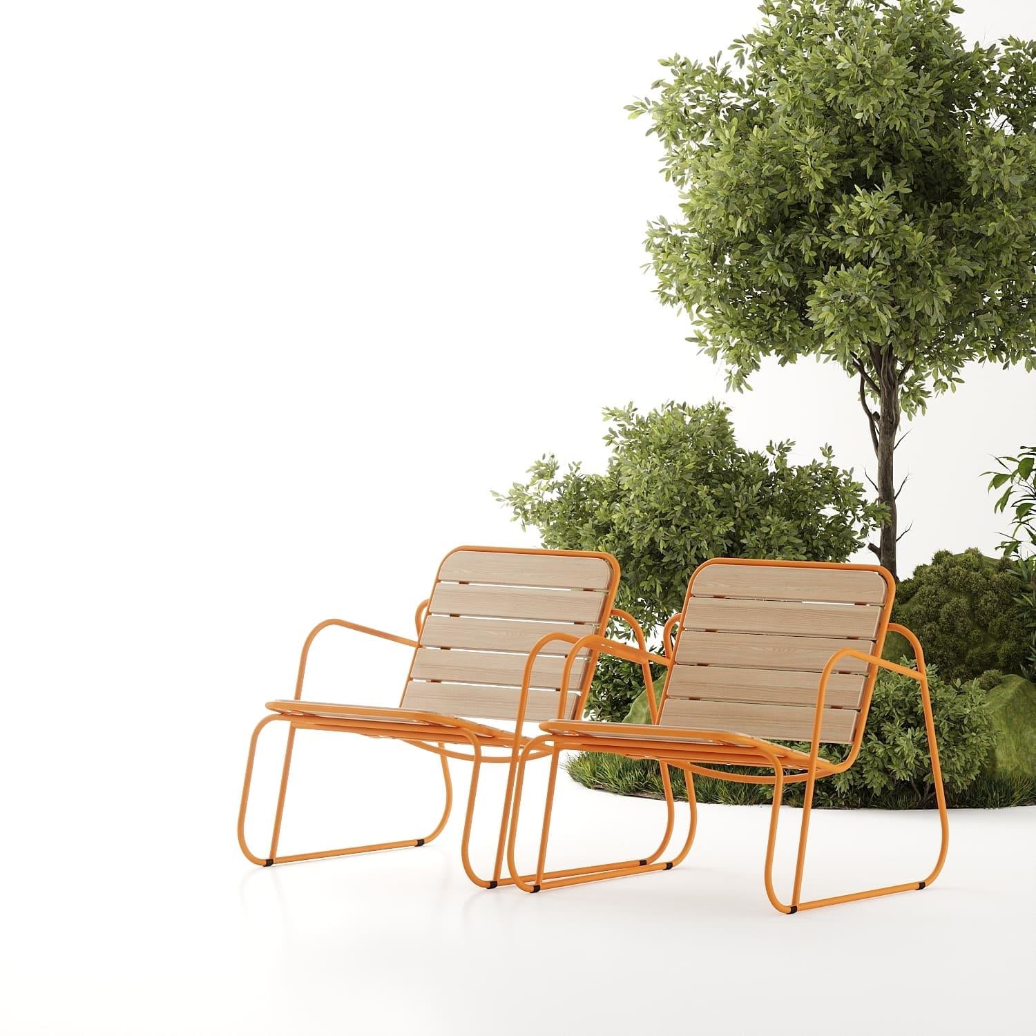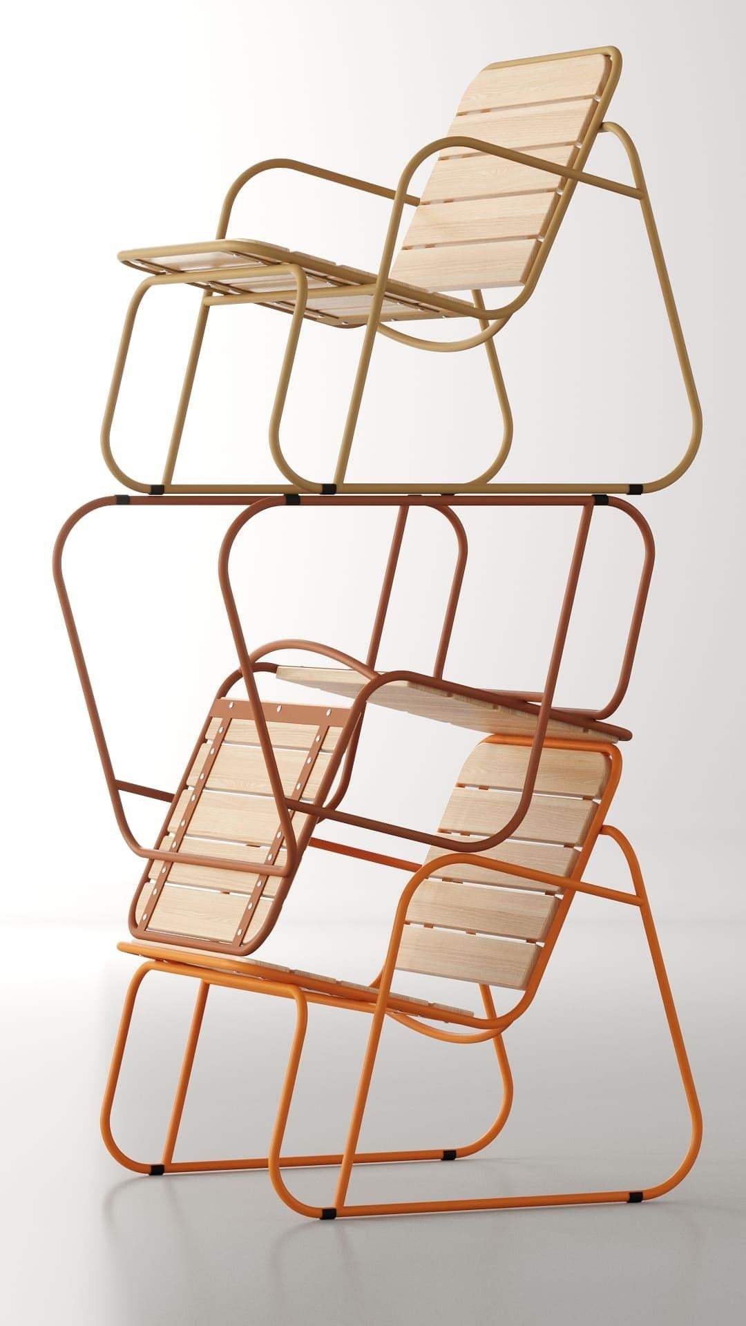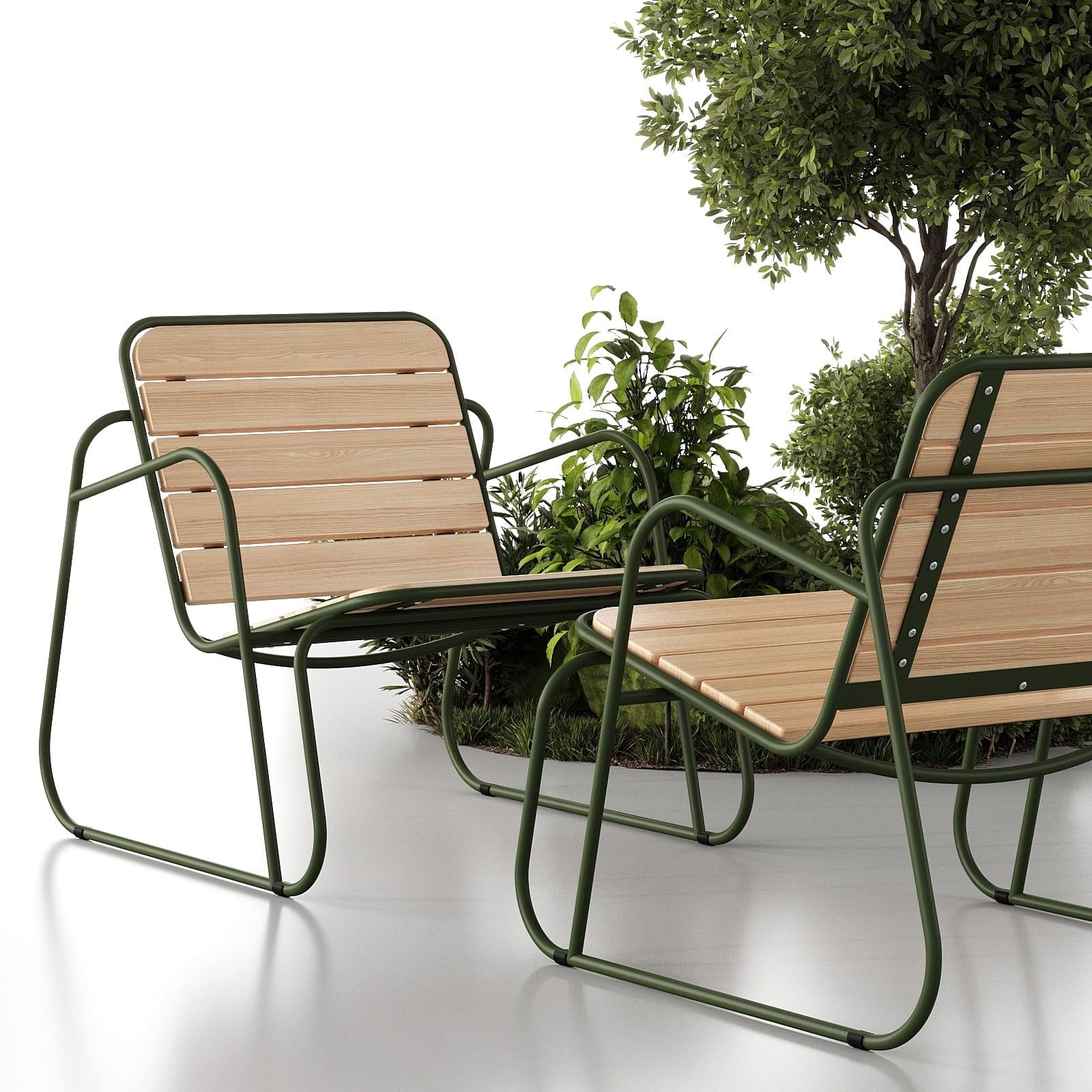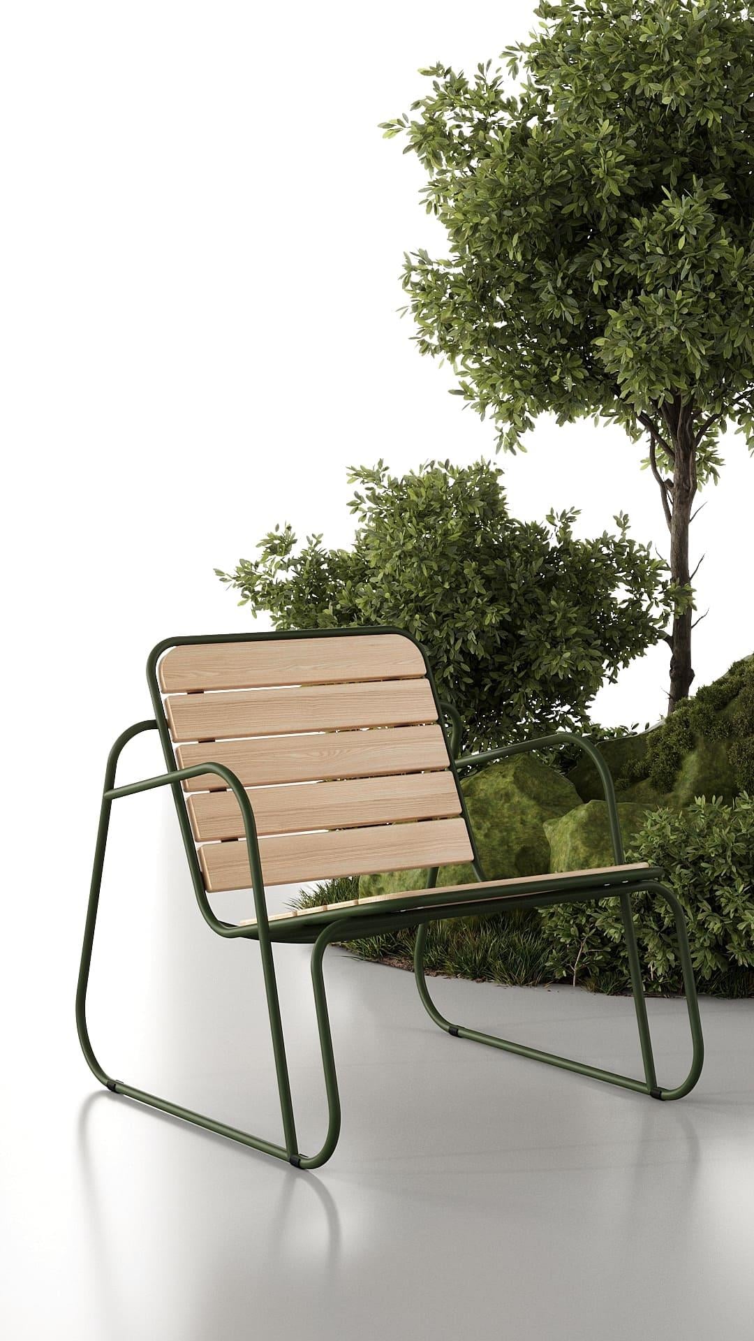Новый дизайн продолжает исследование технологий сгиба стальной трубы, в сочетании с деревянными элементами. Плавные линии конструкции образуют надежную раму, к которой крепится сиденье и спинка из деревянных реек. Они обеспечивают баланс комфорта и эксплуатационной надежности при использовании на улице. Защищенное уличным маслом с твердым воском, такое сиденье позволяет стекать воде, а значит оно быстрее сохнет после дождя, что идеально подходит для отдыха под открытым небом.