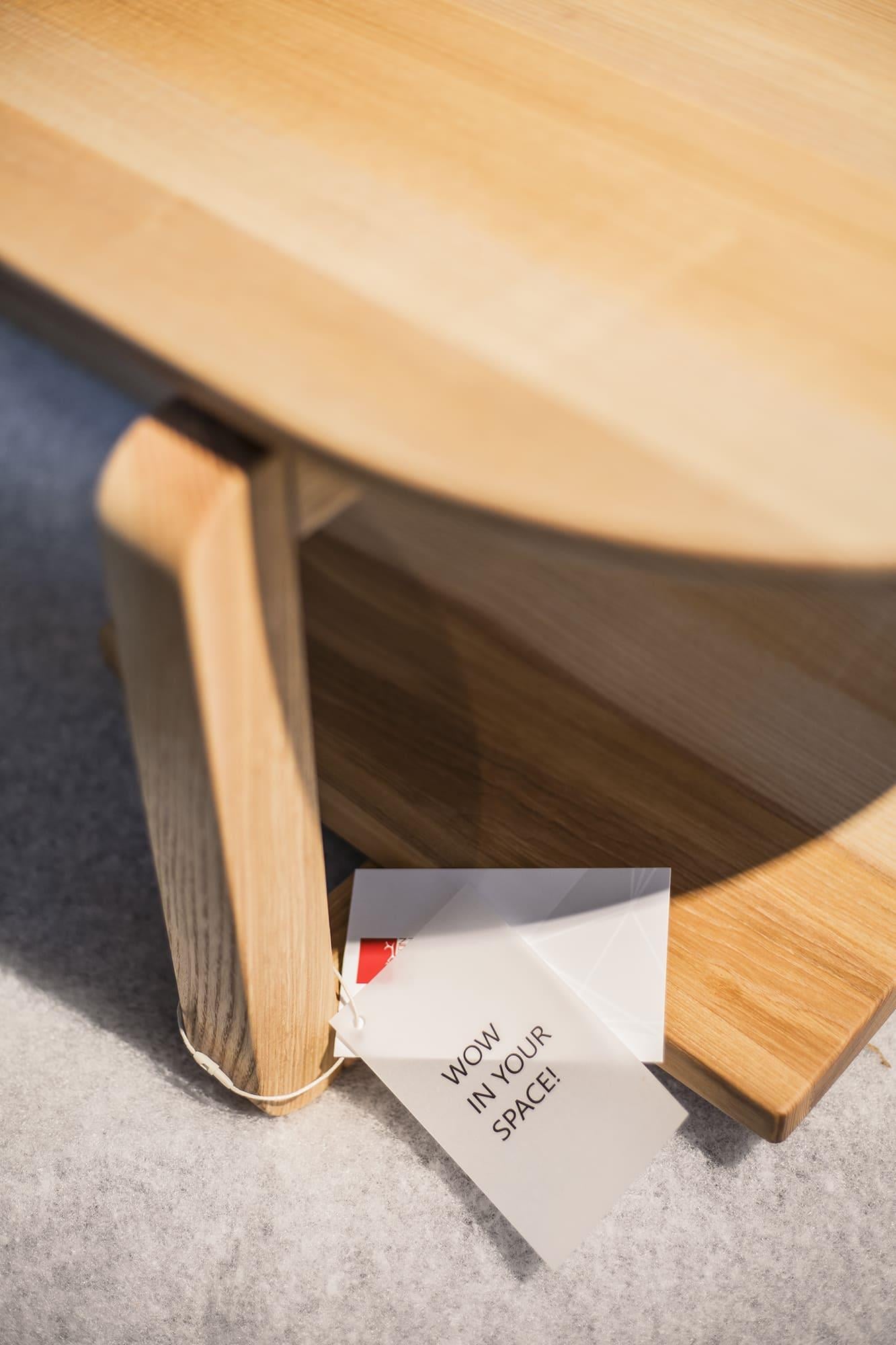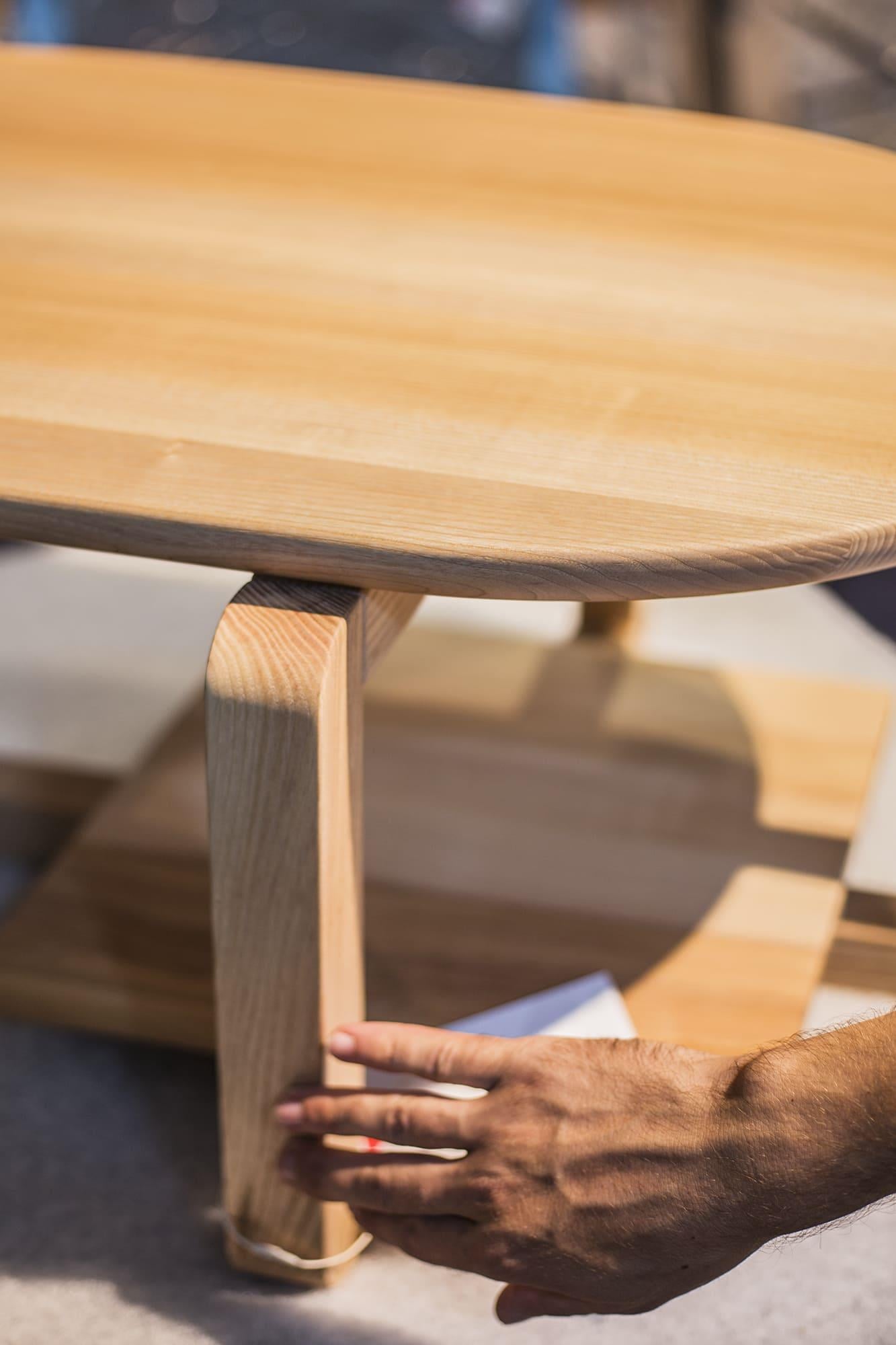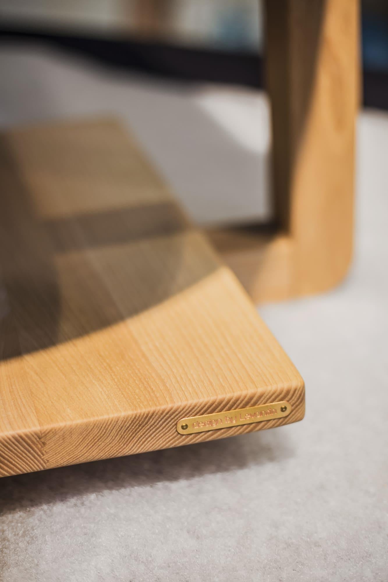 Основание: массив ясеня (по запросу доступен дуб), накладки для защиты пола, латунный знак подлинности. Покрытие: масло с твёрдым воском OSMO (Германия); полиуретановая эмаль для дерева KEMICHAL (Италия). Поверхность: шелковисто-матовая. Уход: любую пролитую жидкость нужно сразу промокнуть салфетками. Затем удалить мыльным раствором и вытереть насухо впитывающей тканью.