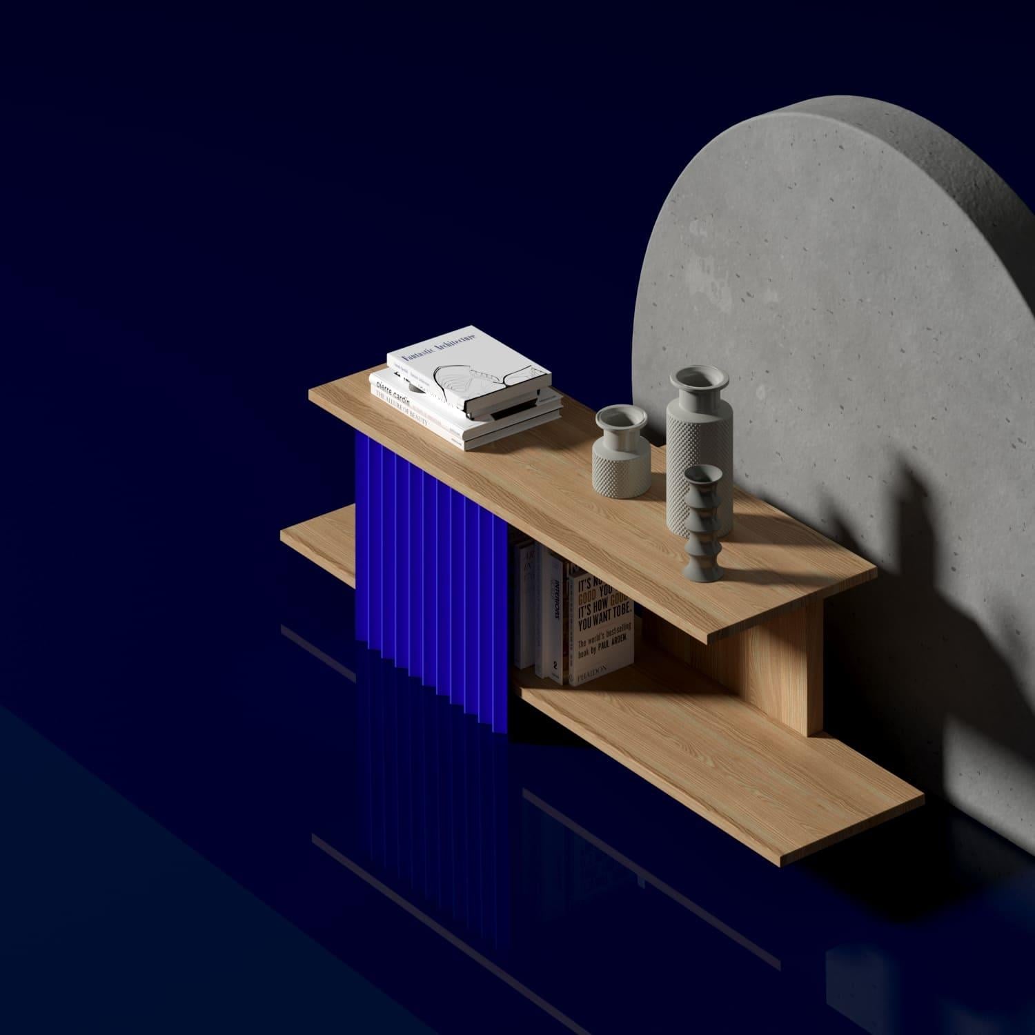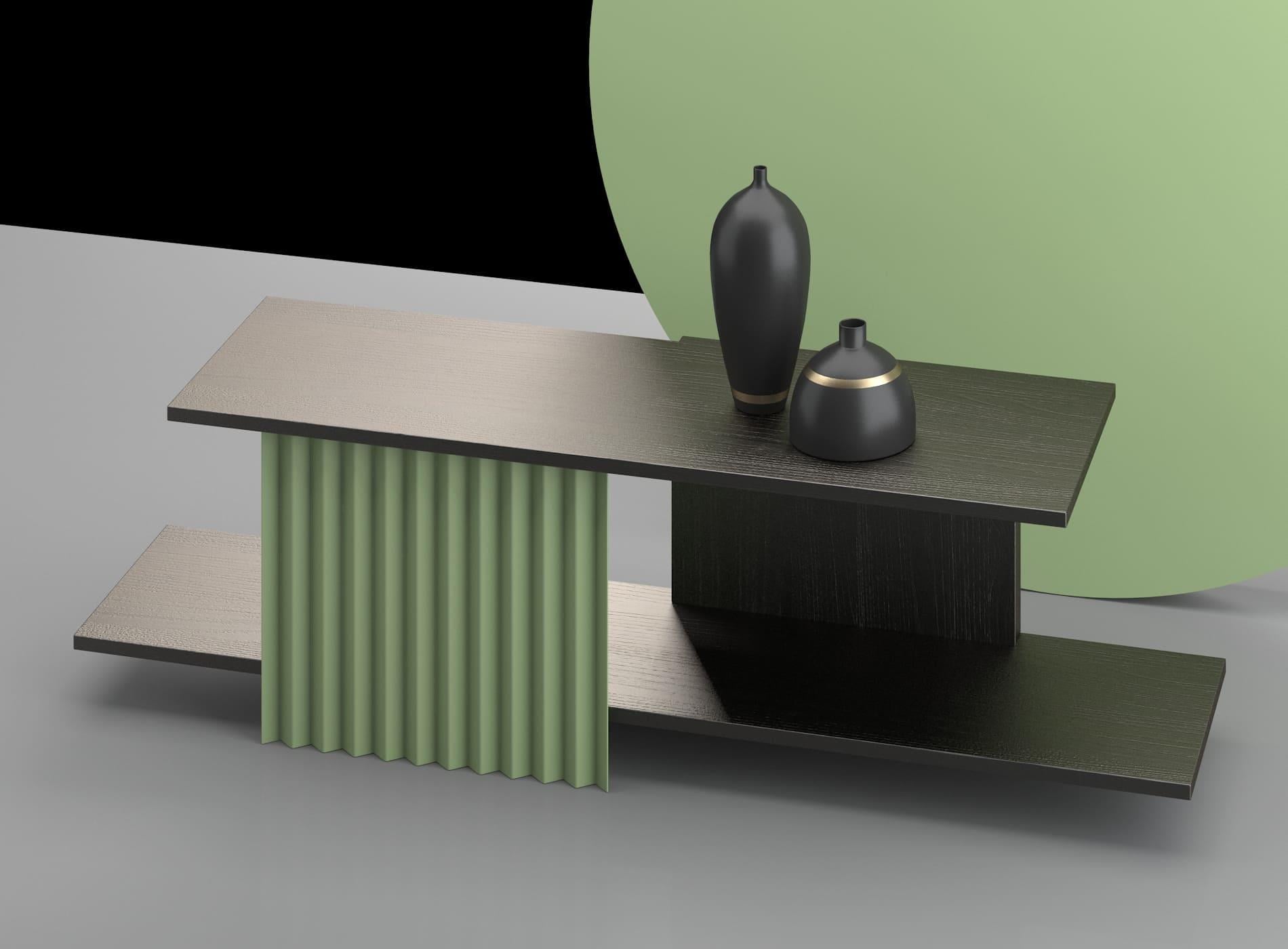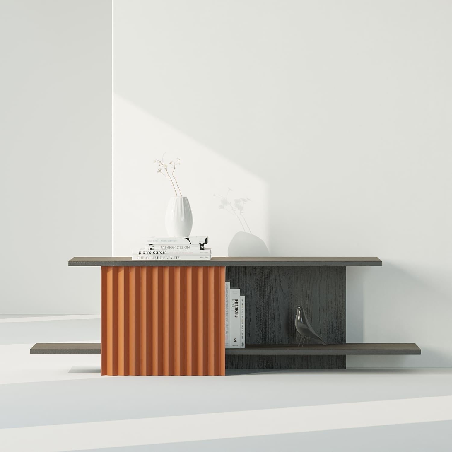Тумба Leiwen — це функціональне місце зберігання з естетичним дизайном. Її зовнішній вигляд уособлює монолітність і природність дерев'яних поверхонь. Їхня симетрія створює стабільність, при цьому певні ракурси демонструють оманливу ілюзію левітації. Композиція елементів конструкції Leiwen складена на манер китайських ієрогліфів. Цьому вторить і акцентний фасад із металевого листа, складений гармонікою.