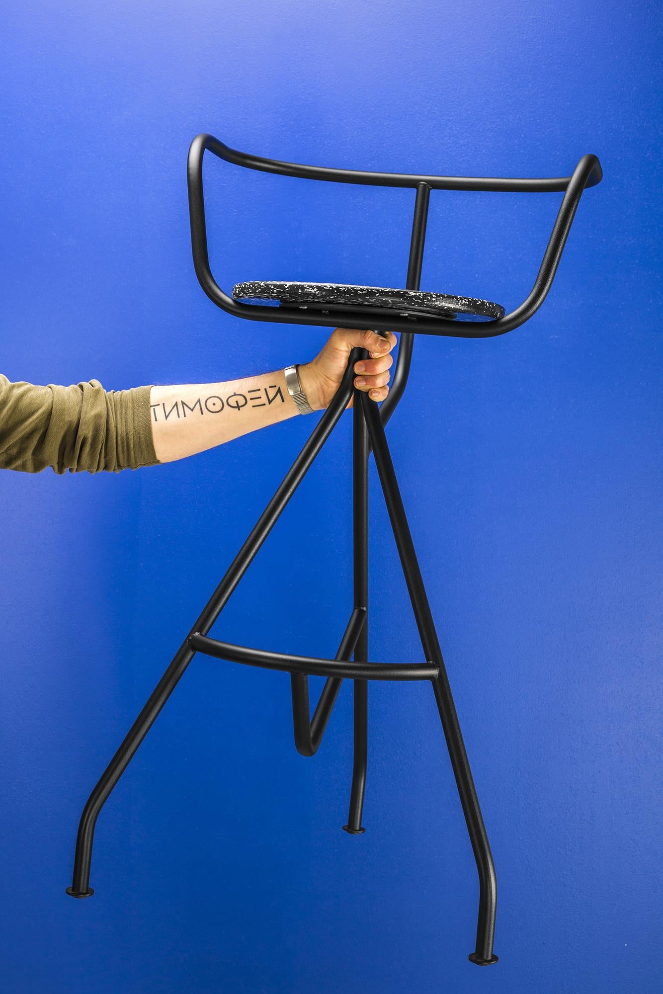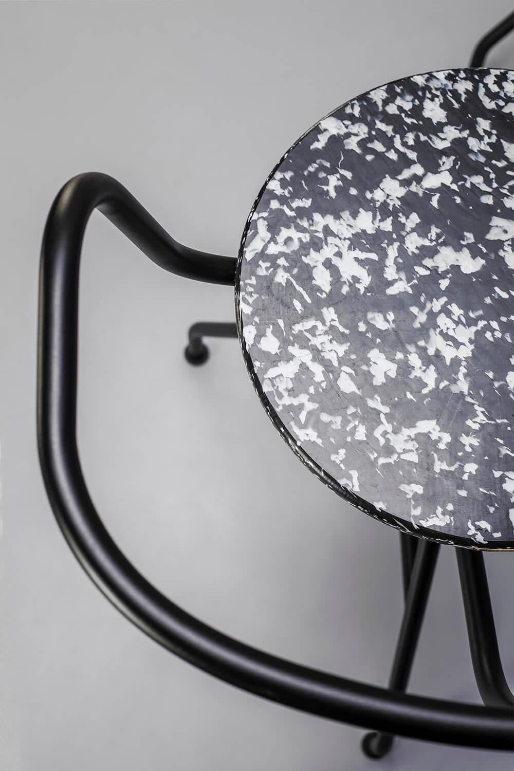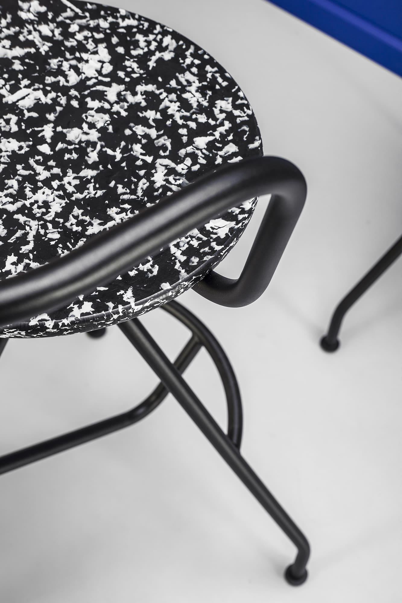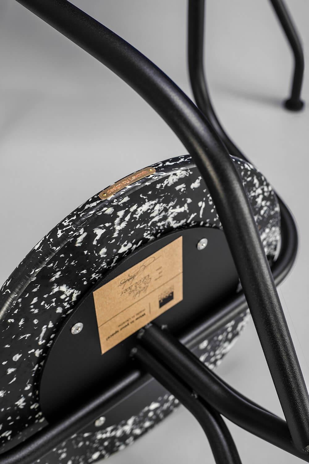 Сидіння із переробленого пластику створила для нас одеська майстерня Precious plastic Ukraine. Полотно товщиною 20 мм виготовлене з вторинного поліетилену HDPE, сировиною для якого стали використані білі та чорні флакони від шампунів. Це супер-матеріал не тільки завдяки вторинному використанню, а й через свої функціональні властивості: нетоксичний, стійкий до сонячного УФ-випромінювання, витримує низькі температури, не боїться впливу води, кислот, лугів. Для його виготовлення, для початку, флакони збирають, промивають, сортують і подрібнюють спеціальними подрібнювачами. Після цього потрібні по кольорах гранули поєднуються і піддається нагріванню і стиску під тиском, отримуючи рівну плиту. Після того, як пластик застиг, виріб потрібної форми вирізається на ЧПУ верстаті, і, вуаля, сидіння готове!