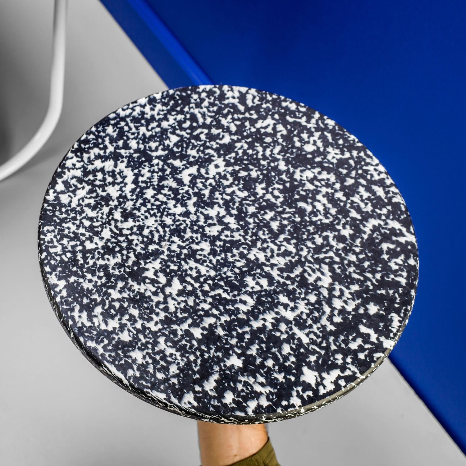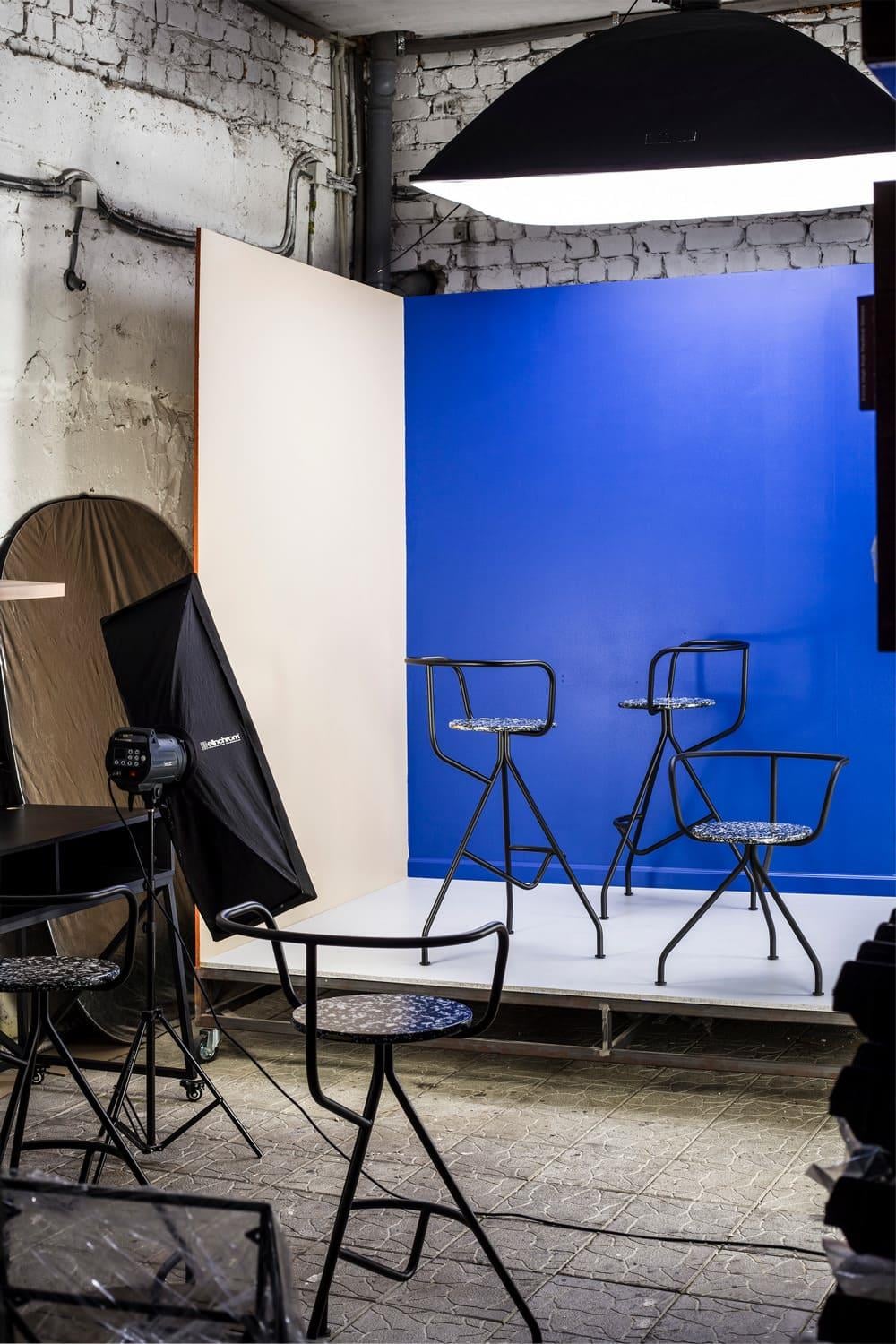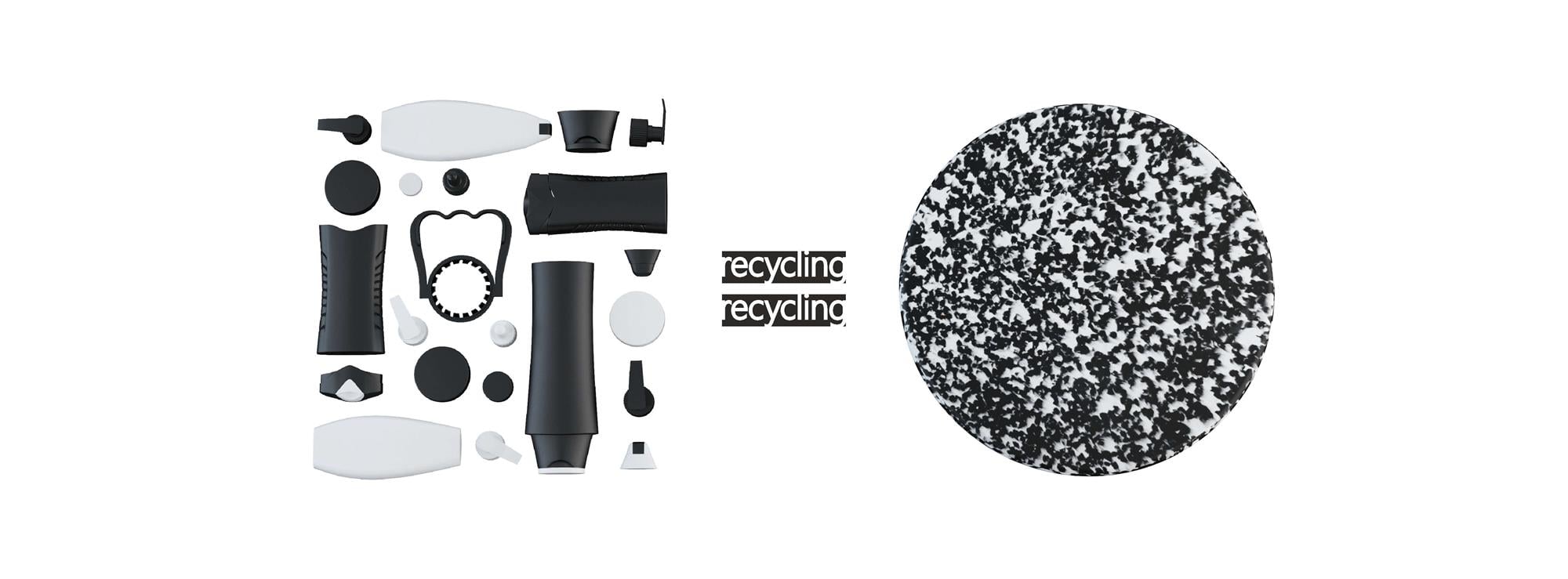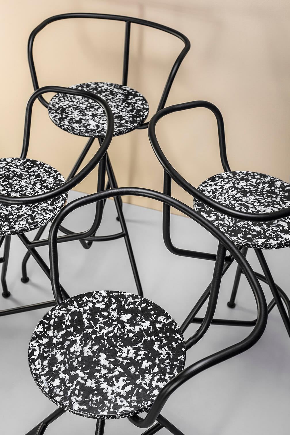 Сидіння із переробленого пластику створила для нас одеська майстерня Precious plastic Ukraine. Полотно товщиною 20 мм виготовлене з вторинного поліетилену HDPE, сировиною для якого стали використані білі та чорні флакони від шампунів. Це супер-матеріал не тільки завдяки вторинному використанню, а й через свої функціональні властивості: нетоксичний, стійкий до сонячного УФ-випромінювання, витримує низькі температури, не боїться впливу води, кислот, лугів. Для його виготовлення, для початку, флакони збирають, промивають, сортують і подрібнюють спеціальними подрібнювачами. Після цього потрібні по кольорах гранули поєднуються і піддається нагріванню і стиску під тиском, отримуючи рівну плиту. Після того, як пластик застиг, виріб потрібної форми вирізається на ЧПУ верстаті, і, вуаля, сидіння готове!