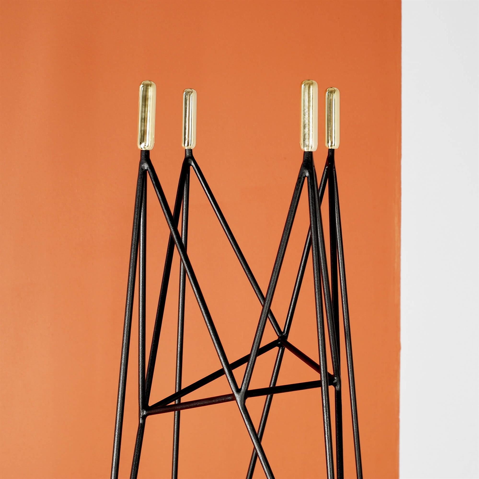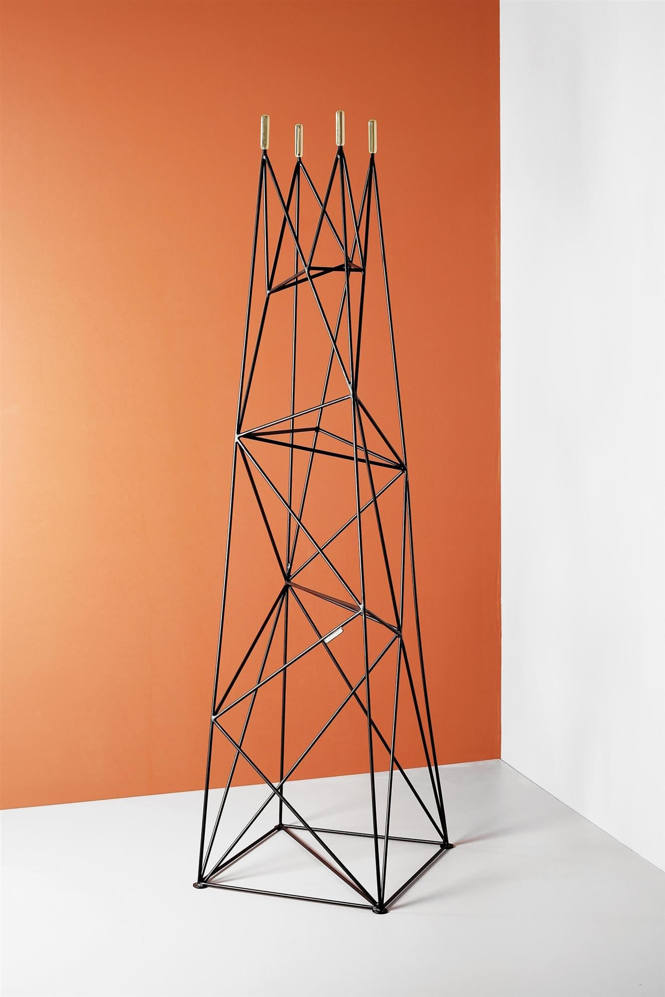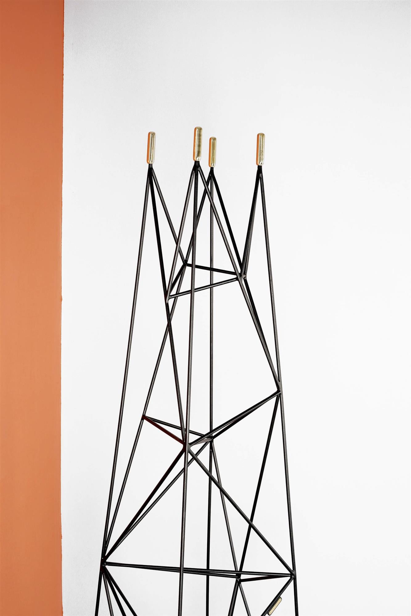 The Skala rack symbolises a sturdy object, in the form of a pointed mountain, serving as a place to place clothes. The metallic chaos of lines taper smoothly towards the top, representing the steep slopes on which wardrobe items can be placed. The architectural structure is rounded off by brass ends converging into cylinders.