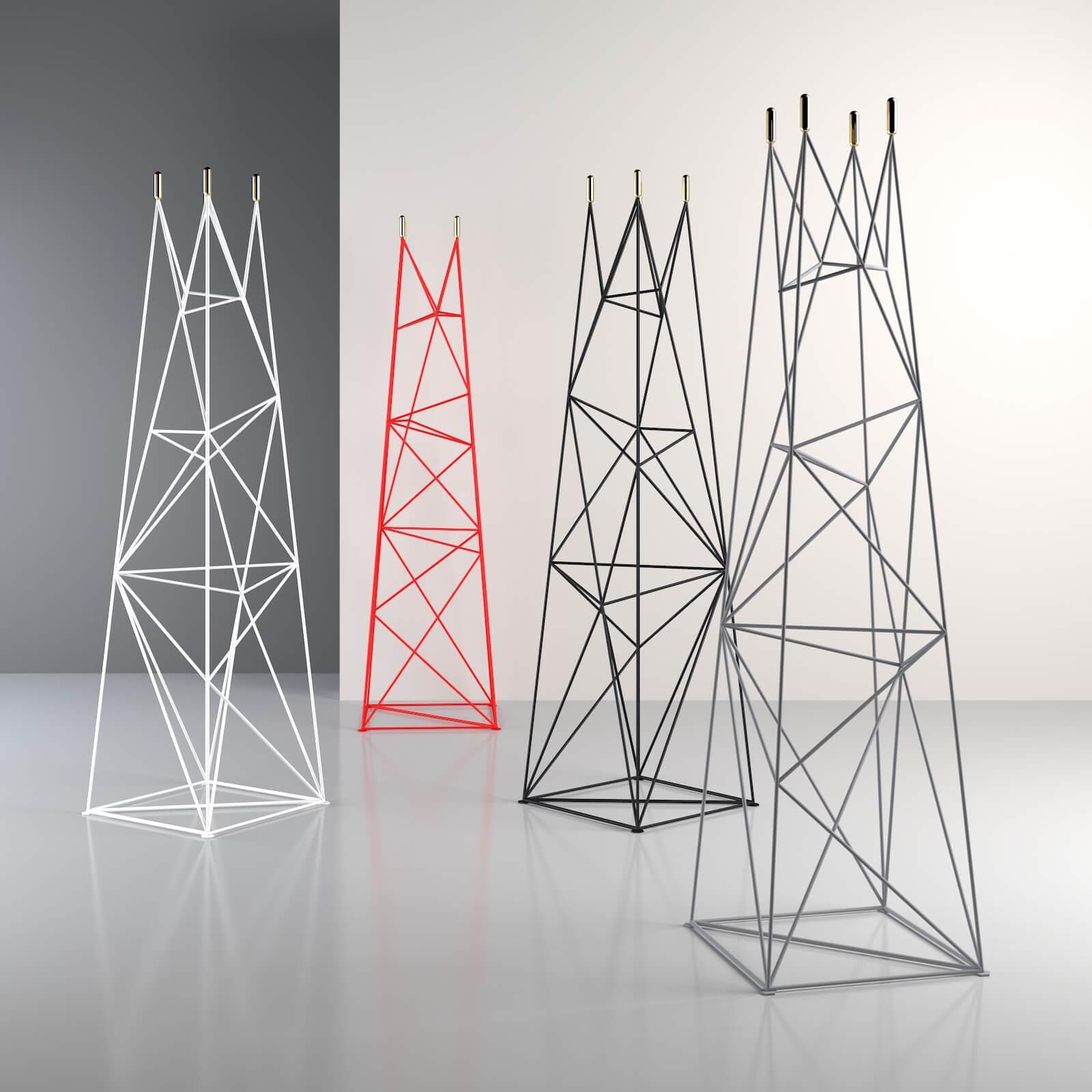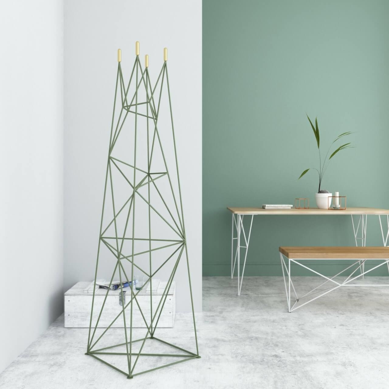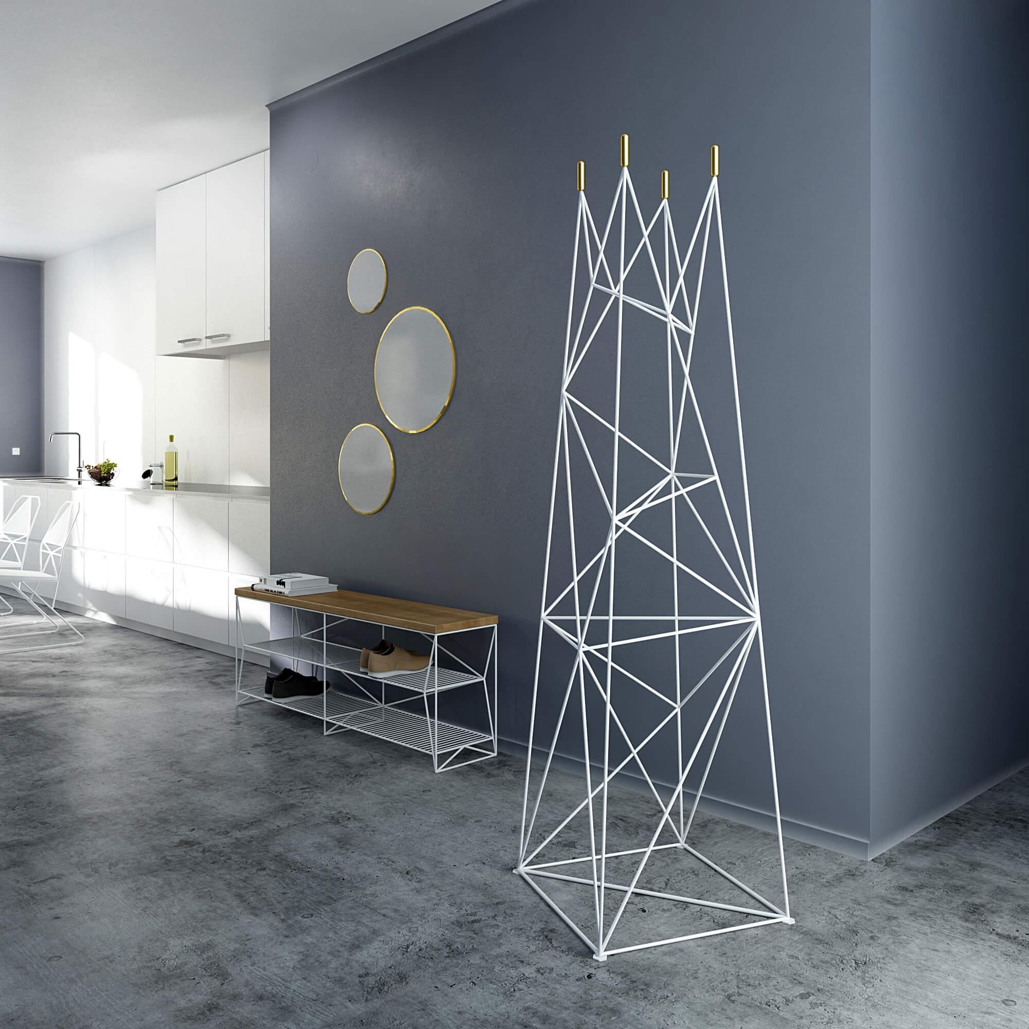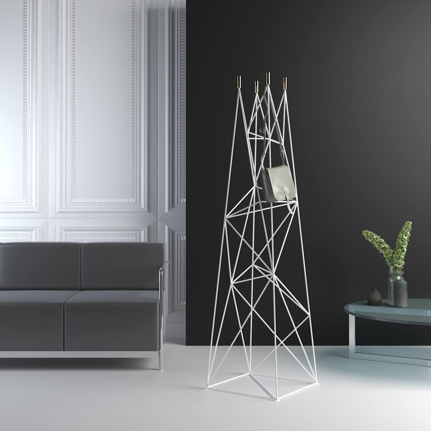 The Skala rack symbolises a sturdy object, in the form of a pointed mountain, serving as a place to place clothes. The metallic chaos of lines taper smoothly towards the top, representing the steep slopes on which wardrobe items can be placed. The architectural structure is rounded off by brass ends converging into cylinders.
