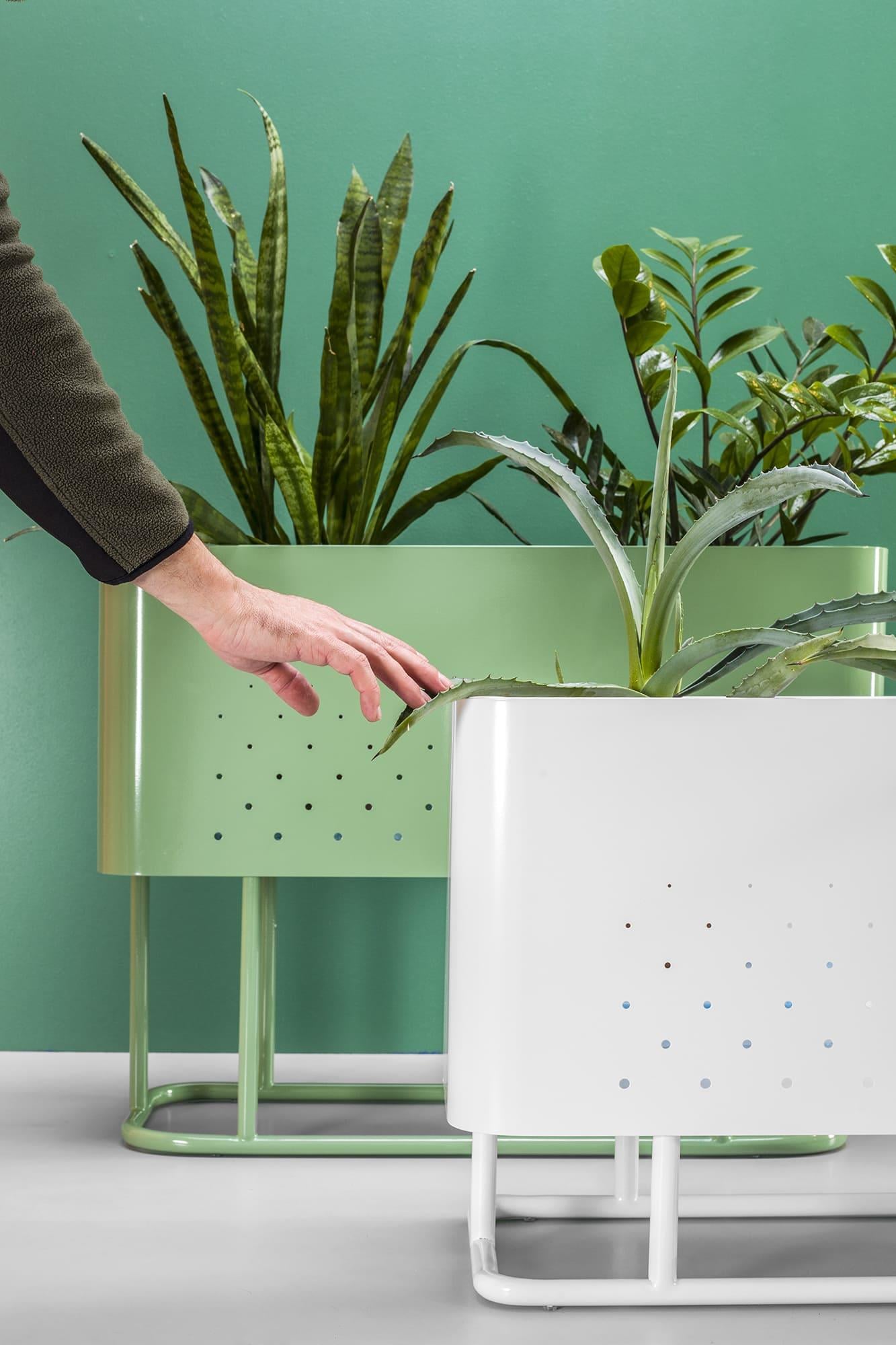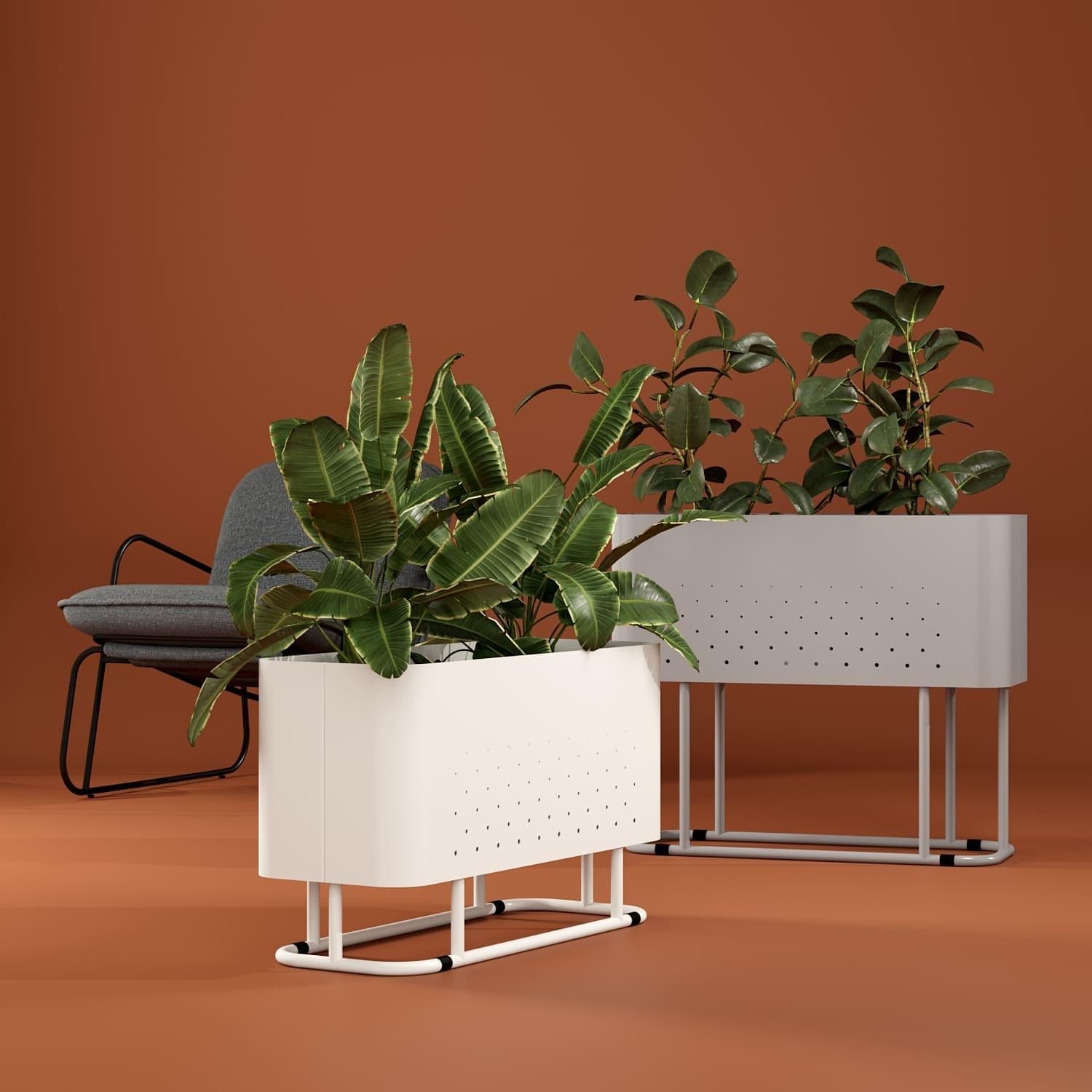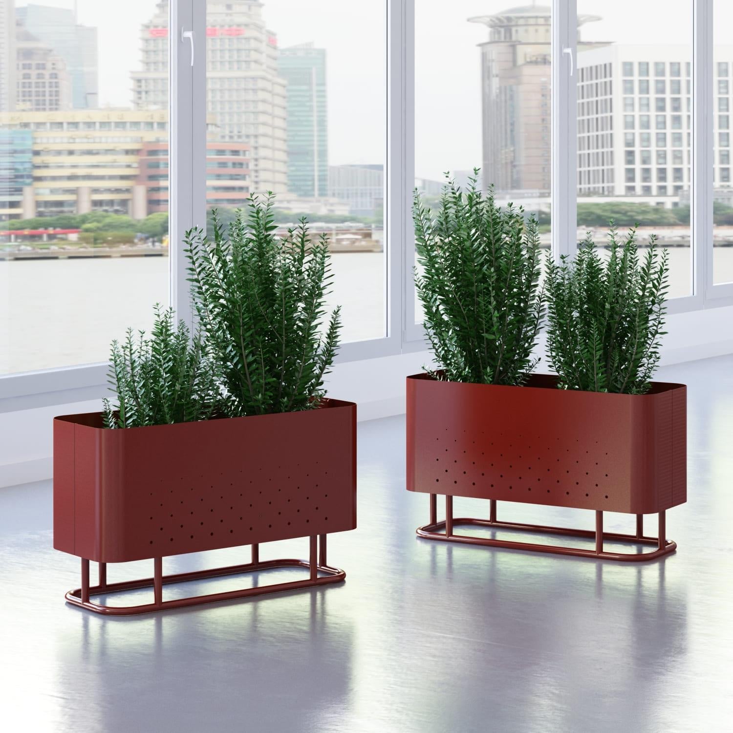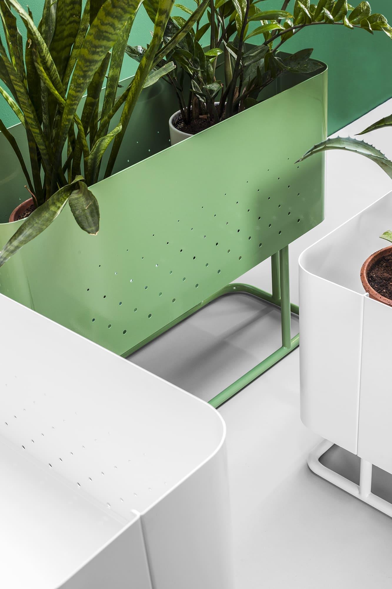 The Aiuola cachepot (from Italian "flowerbed") is an expressive solution for landscaping public spaces. The combination of rounded shapes and a nuanced colour palette has created a decorative planter with a striking personality. The characteristic feature of Aiuola is the smooth curves of the body. For its realisation, the maximum arc radius of a press brake is used. The result is two u-shaped steel sheets, with air perforations on the walls, joined by elegant joints. The bottom of the case is laser-cut, with extra stiffness to avoid sagging. The sturdy tube base is designed all-welded for secure installation and movement.