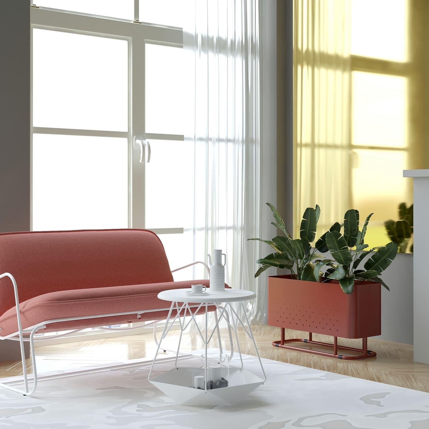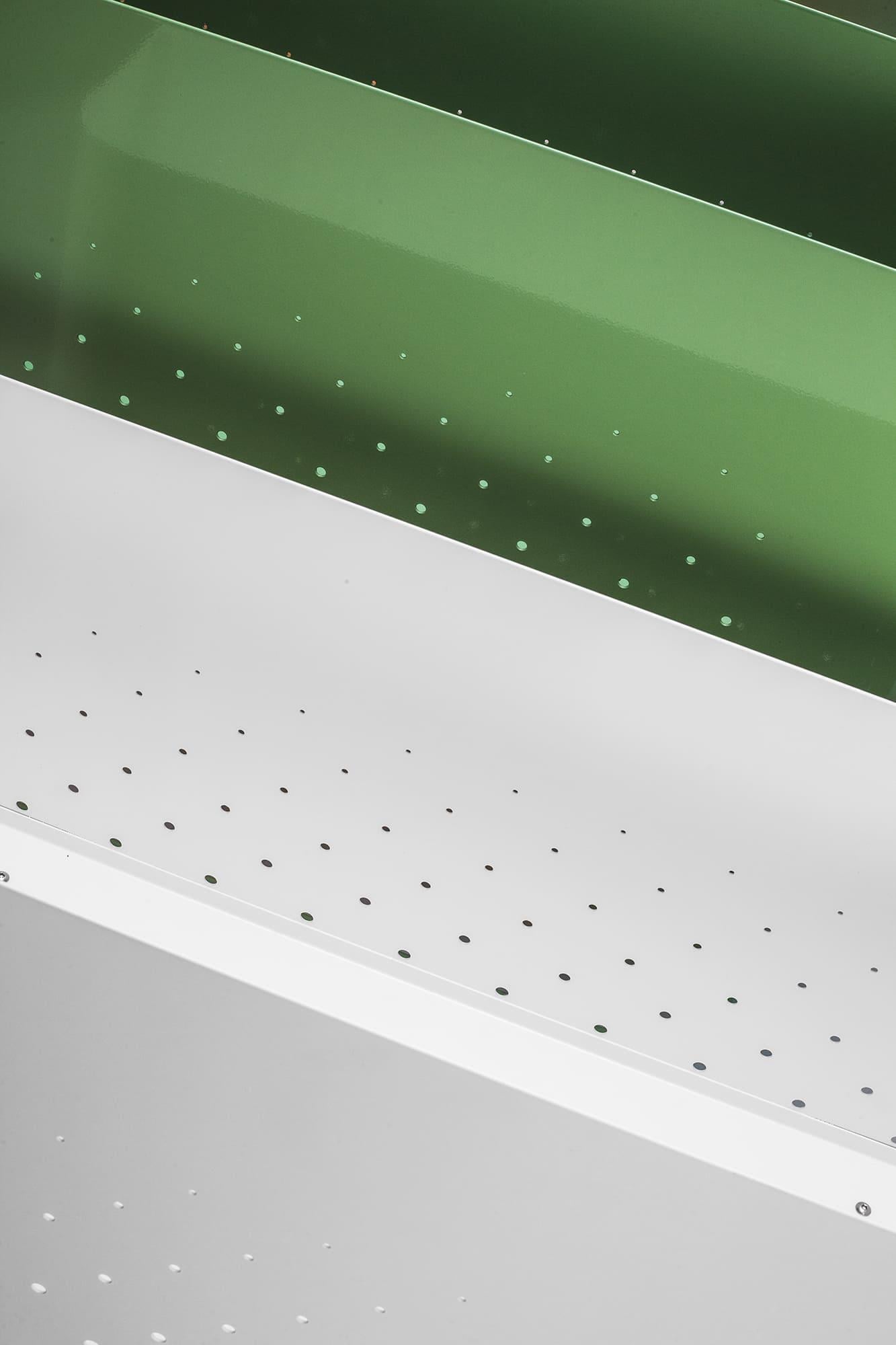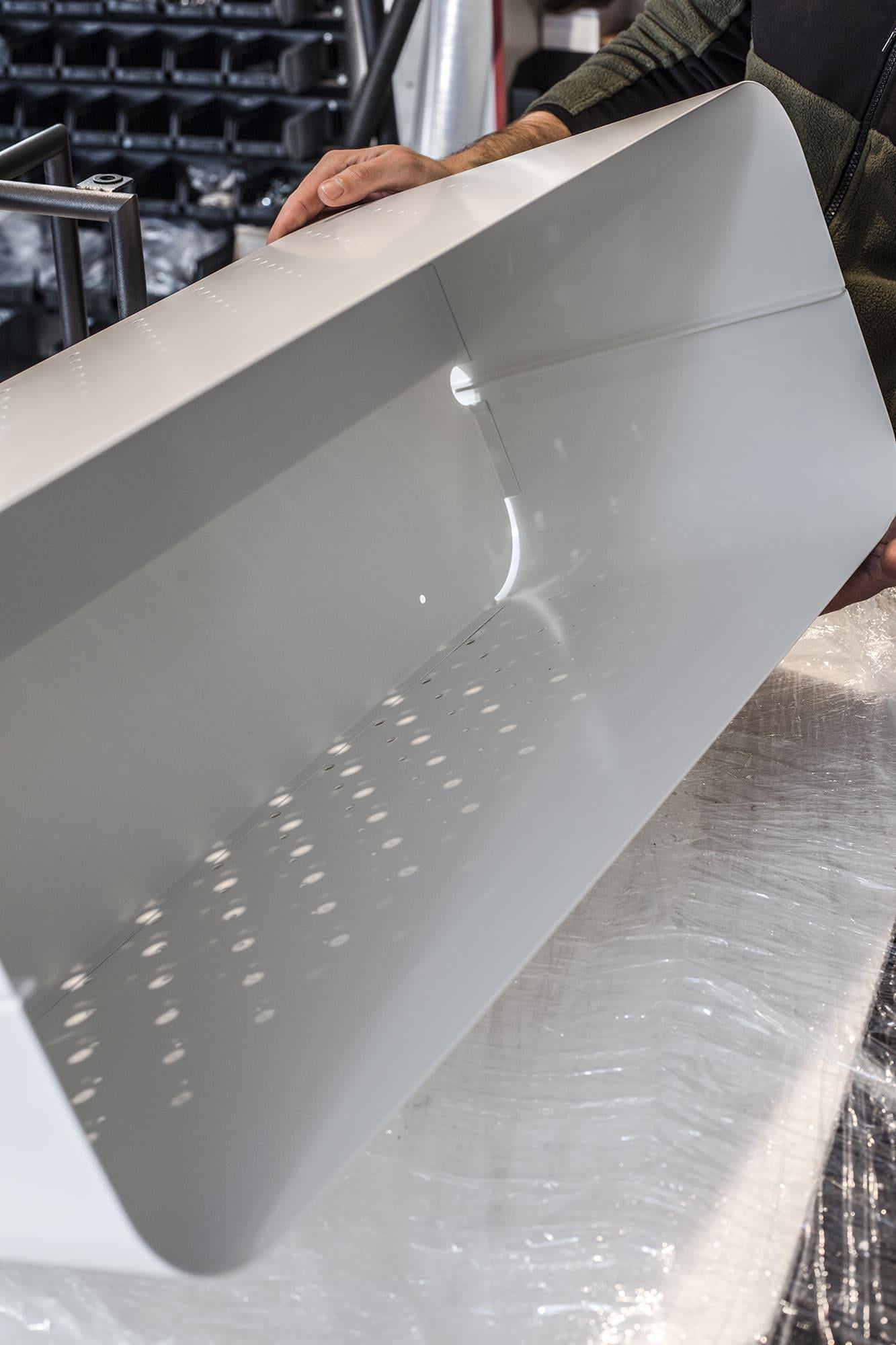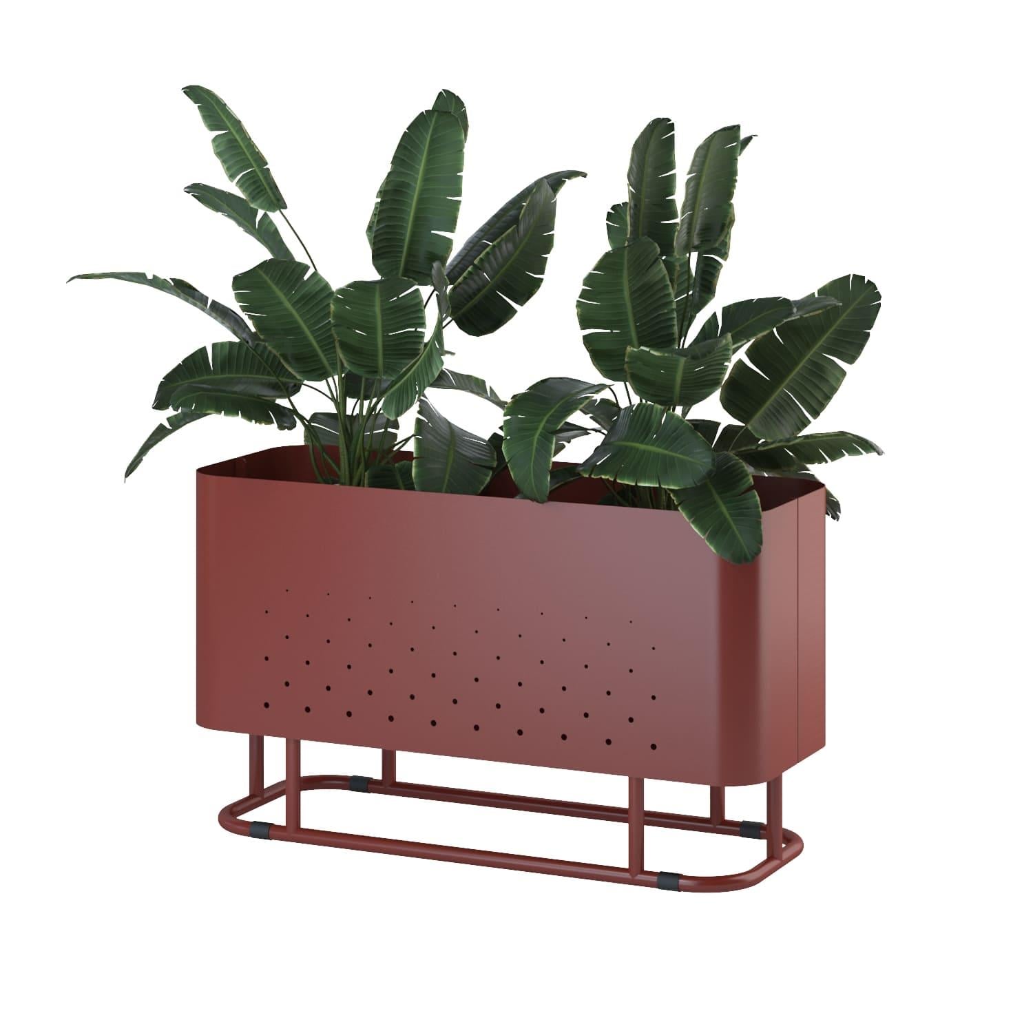 The Aiuola cachepot (from Italian "flowerbed") is an expressive solution for landscaping public spaces. The combination of rounded shapes and a nuanced colour palette has created a decorative planter with a striking personality. The characteristic feature of Aiuola is the smooth curves of the body. For its realisation, the maximum arc radius of a press brake is used. The result is two u-shaped steel sheets, with air perforations on the walls, joined by elegant joints. The bottom of the case is laser-cut, with extra stiffness to avoid sagging. The sturdy tube base is designed all-welded for secure installation and movement.