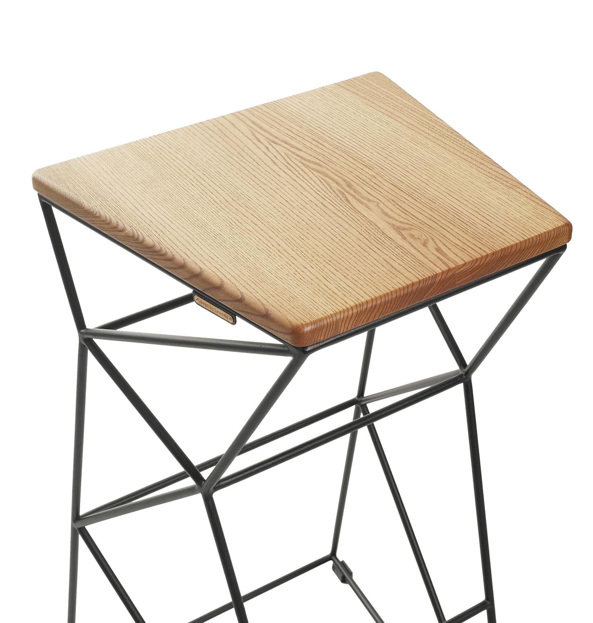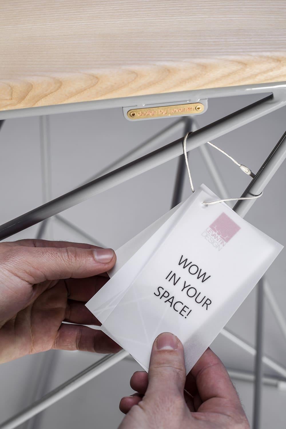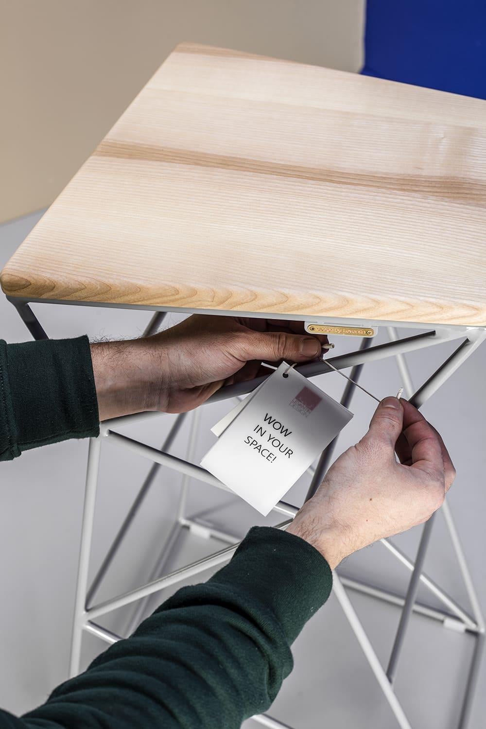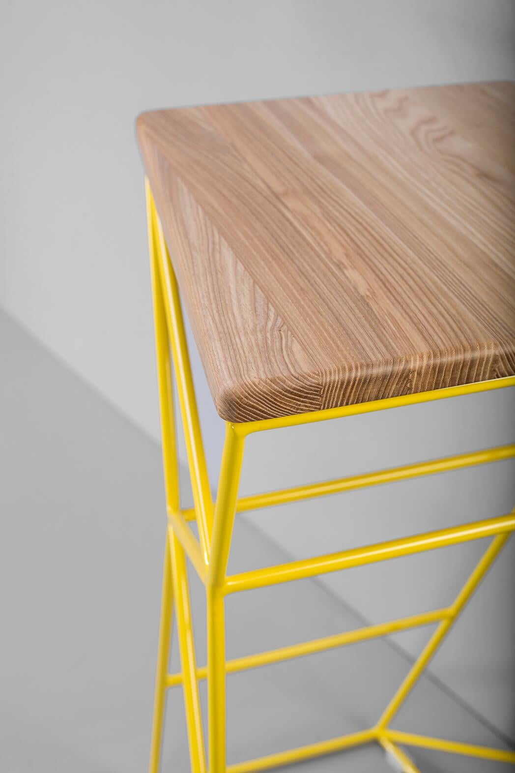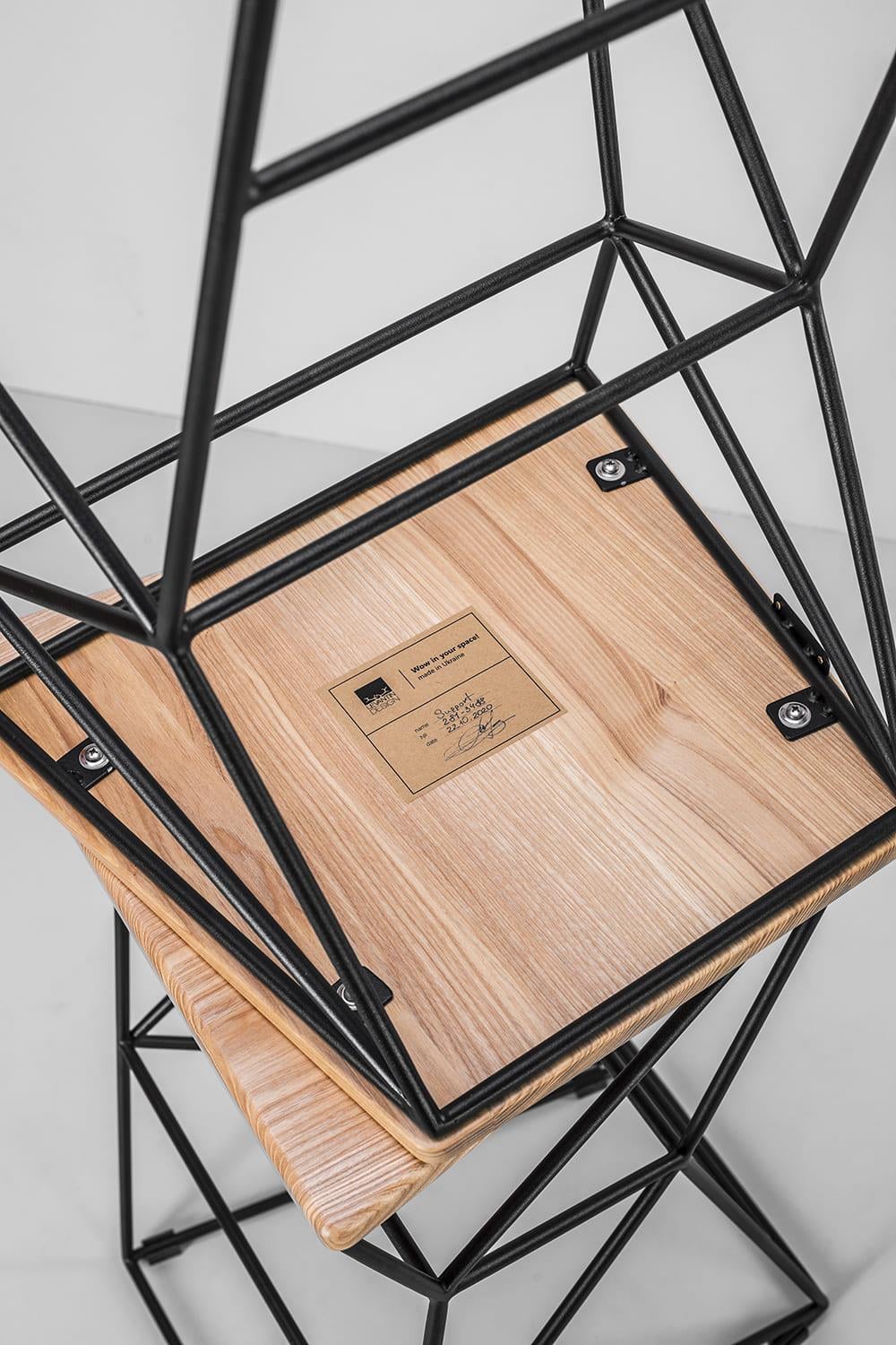 Frame: sled base in 10 mm steel rod, powder coating, floor protection pads, brass hallmark of authenticity. Seat: solid ash wood. Coatings and finishes: OSMO hardwax-oil (Germany); KEMICHAL polyurethane enamel for wood (Italy). Surface: silky matt.