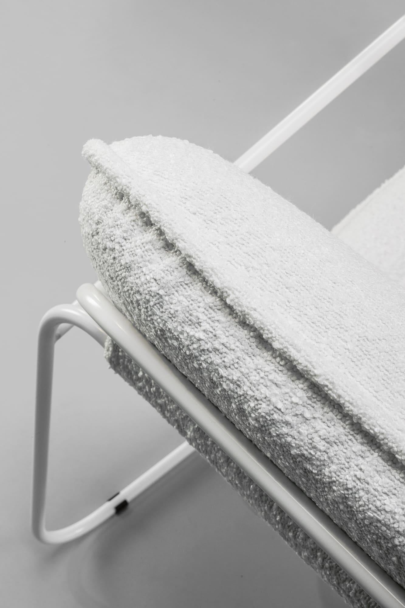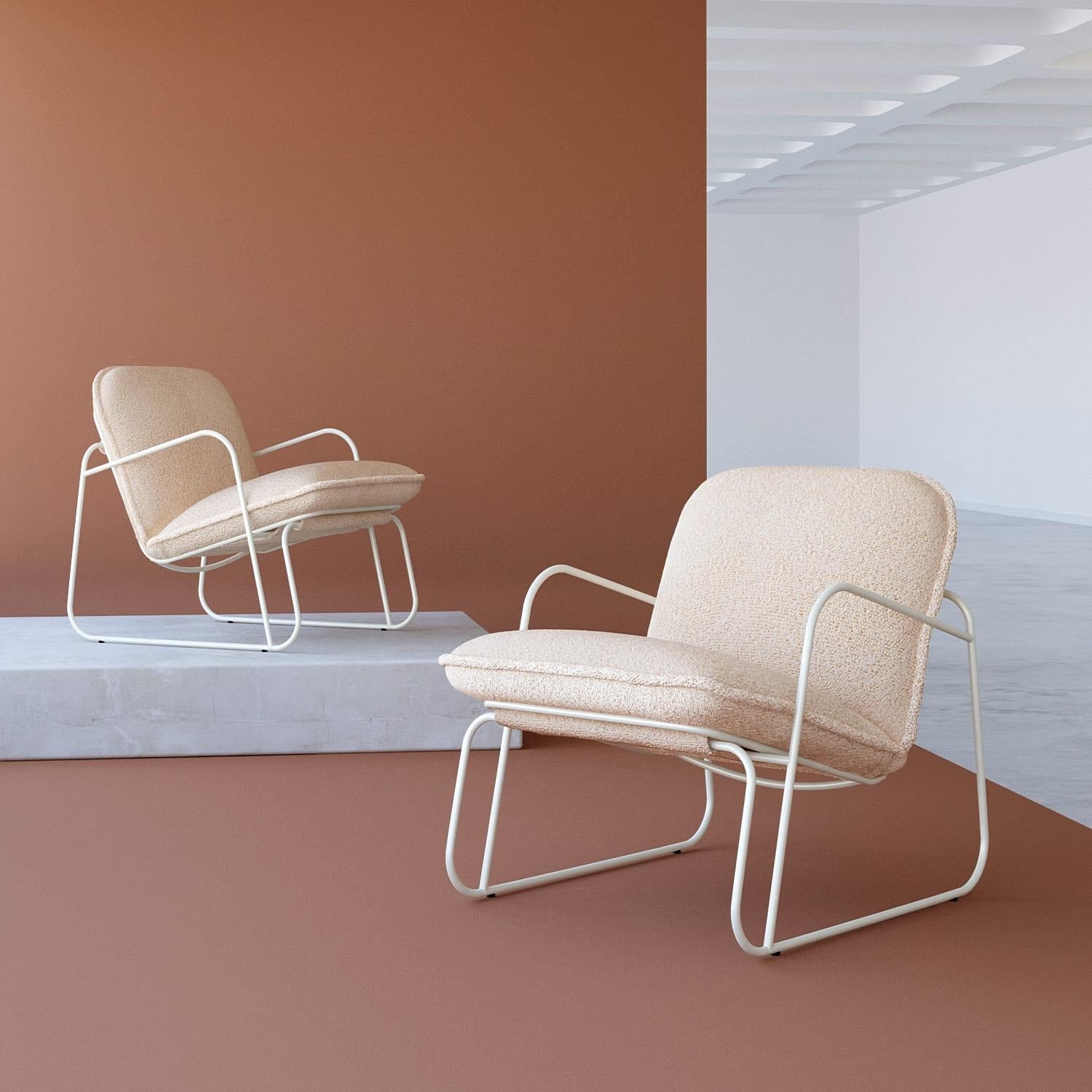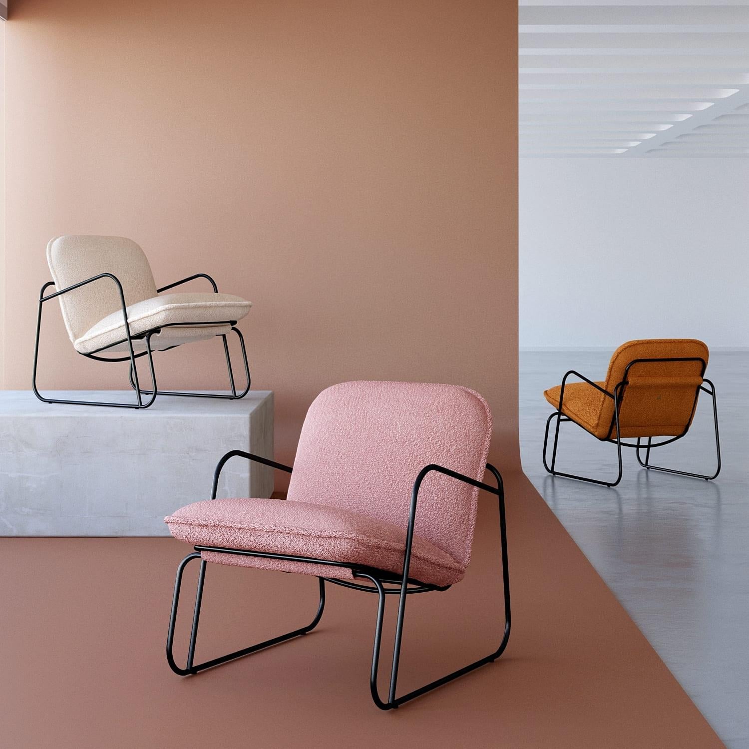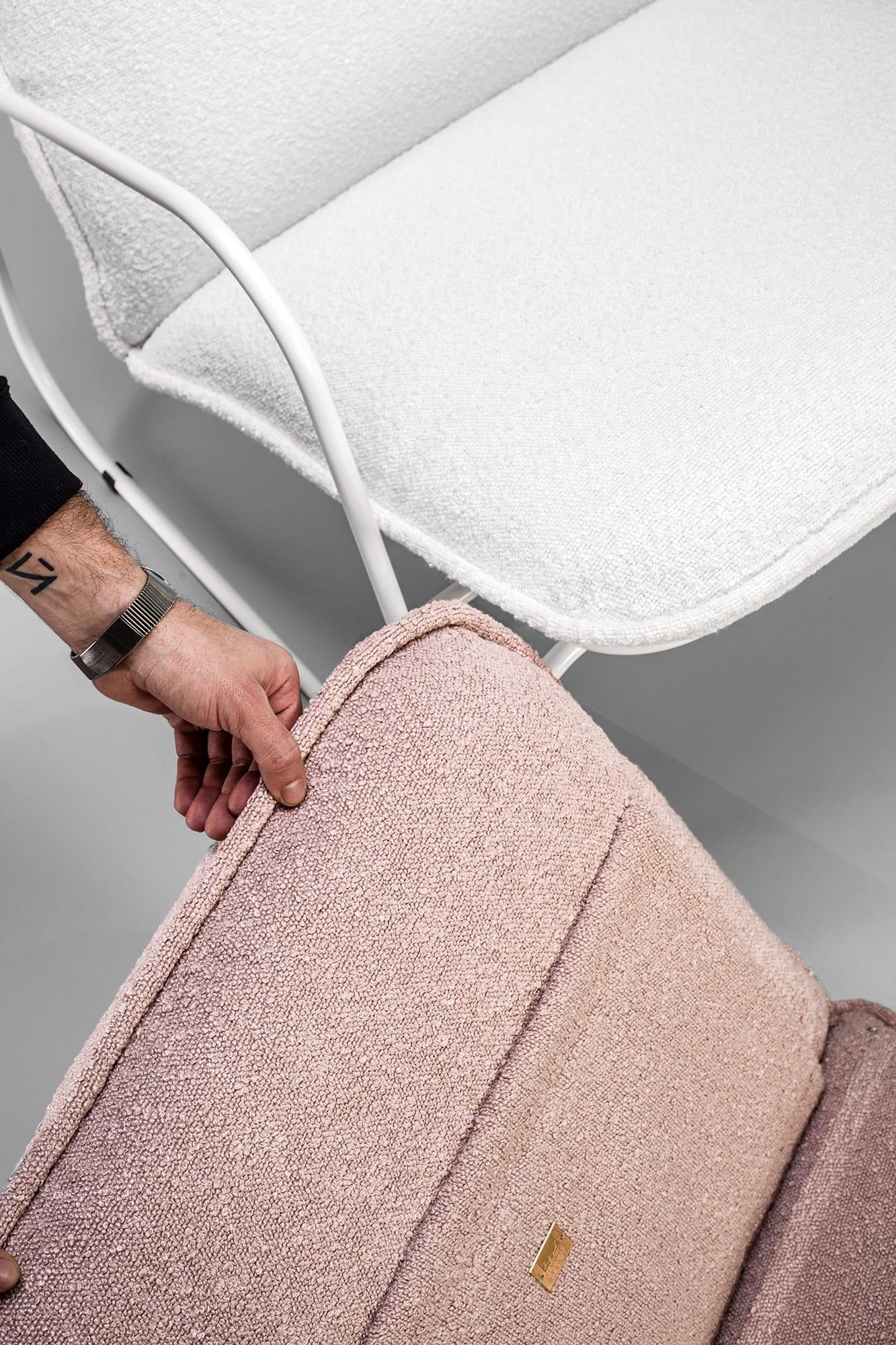 Updated version of the Monteur armchair with an outer cover made of textured bouclé fabric with a voluminous knotted surface. Interchangeable upholstered parts have made it possible to create a family of modular armchairs united by a friendly design. The armchair takes its name from the French word editor. Inspired by a person who thoughtfully cuts away the superfluous, leaving the very essence. Monteur has come to epitomise this craft, with its concise appearance and meticulous detailing. It is characterised by the rounded and harmonious shapes of the seat and backrest, set on a versatile steel frame. And the smooth cant line outlining the silhouette emphasises its clean image. The upholstered part has a removable outer cover with two separate sections for inner cushions. It is quickly attached to the frame with convenient Velcro fasteners. The filling consists of a combination of polyurethane foam, the main cushioning material, and felt padding for elasticity. This has given the seat extra comfort and stability for years of use. The armchair is ideal for laconic interiors in Scandinavian and eco-style. It can be used for home environments as well as more formal spaces and lounges. Monteur boucler is easy to personalise, thanks to the interior textile palette of 20 shades.