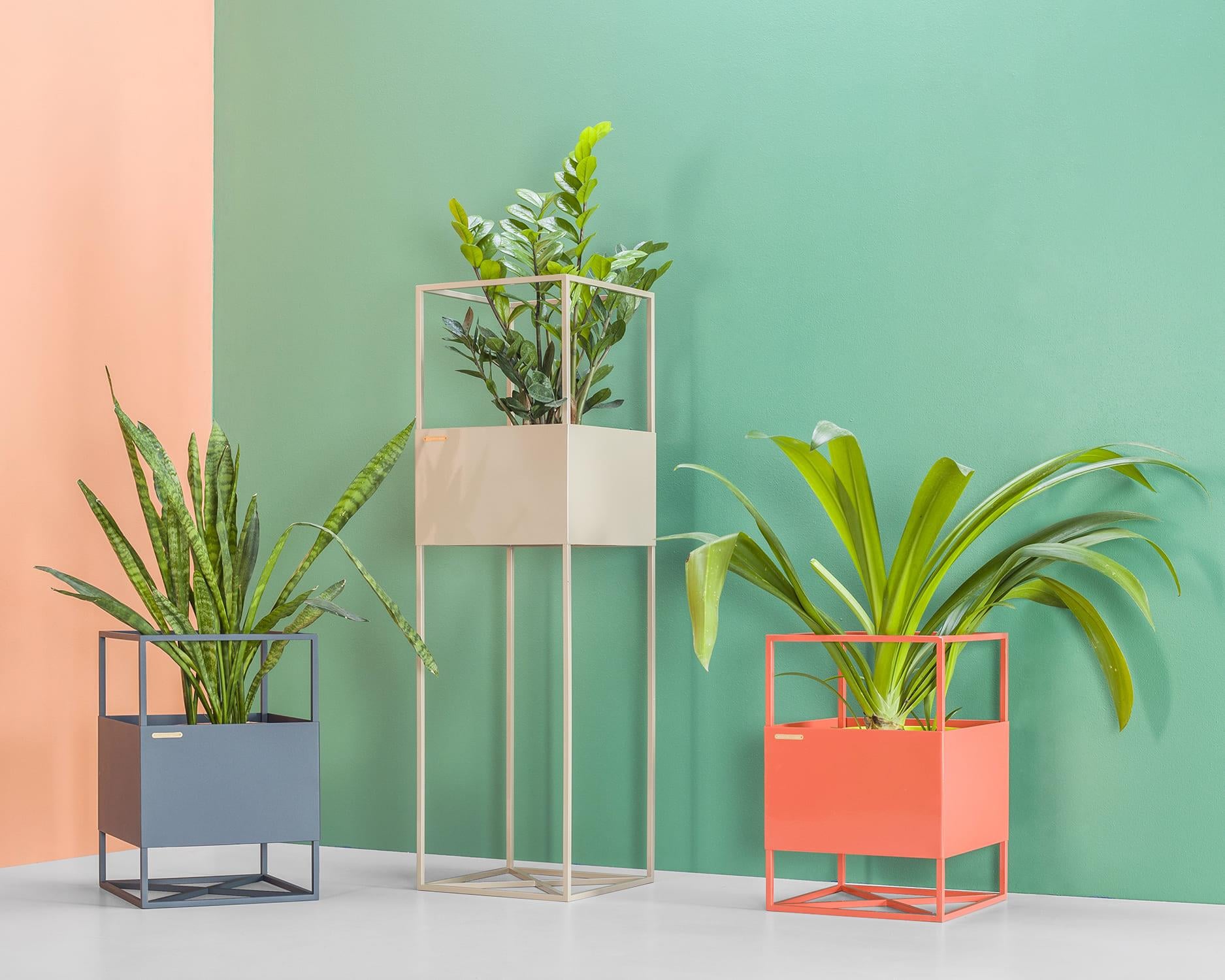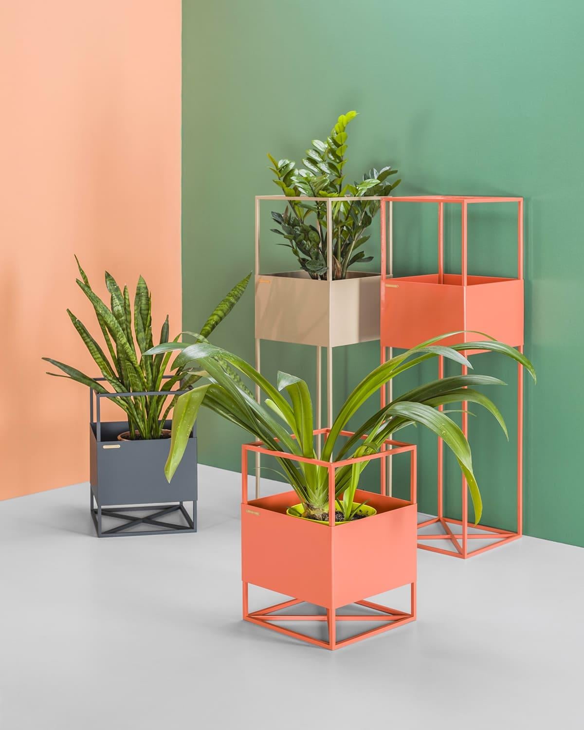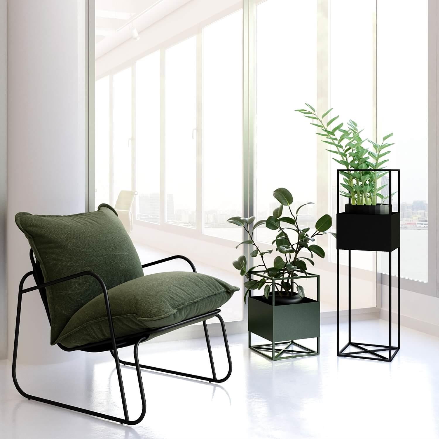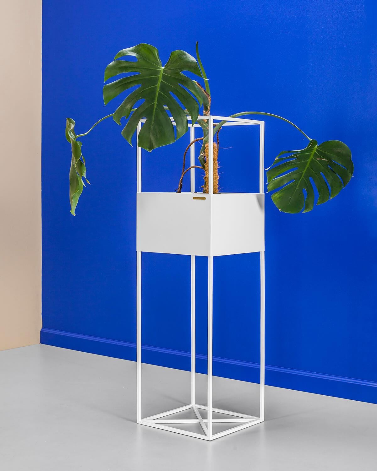 Telaio: filo di acciaio 10 mm, lamiera d'acciaio da 1,5 mm, verniciatura a polvere, protezioni per pavimenti, marchio di autenticità in ottone. Cura: collocare la pianta nel proprio vaso con un drenaggio adeguato, il terreno aperto e umido può distorcere la superficie.