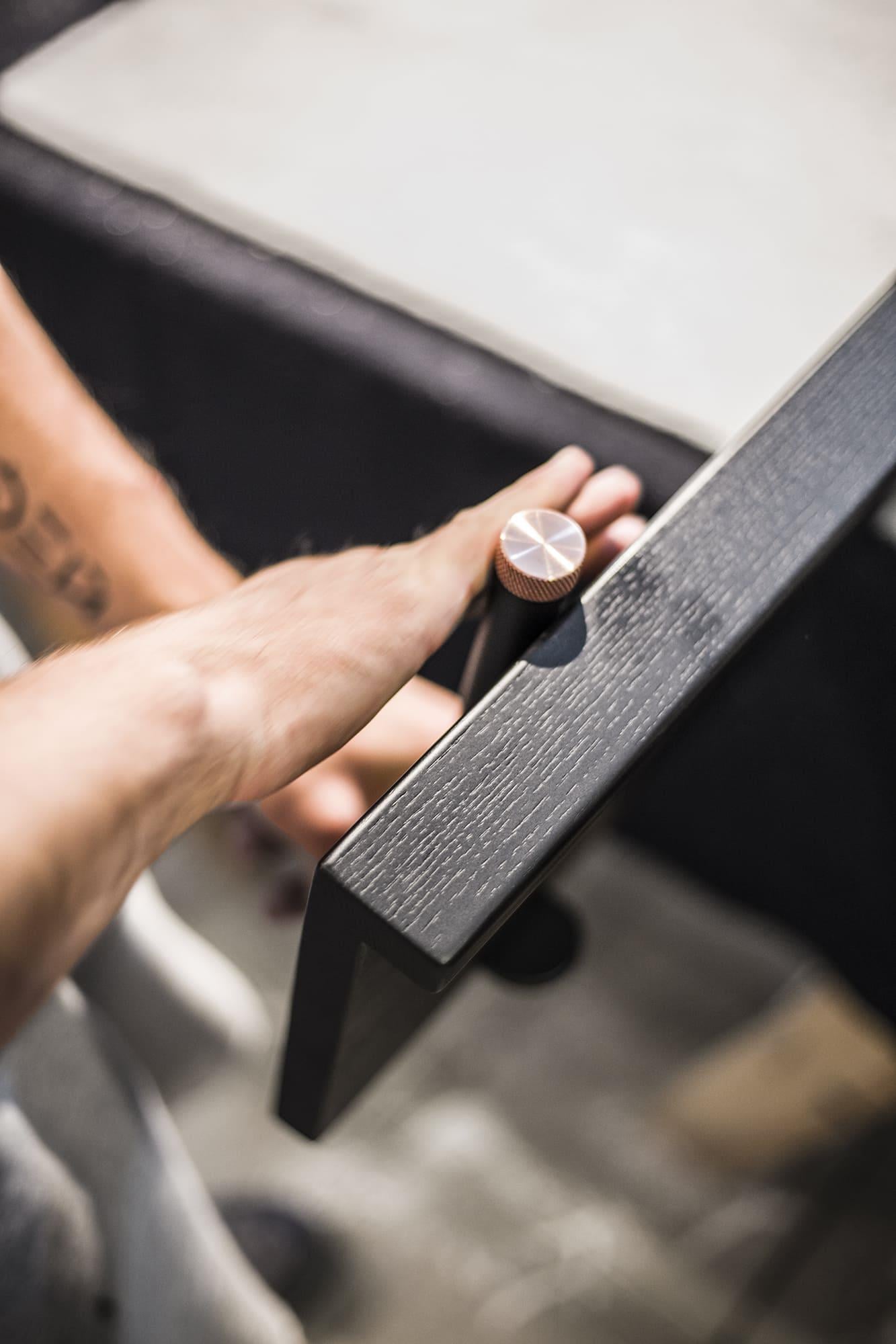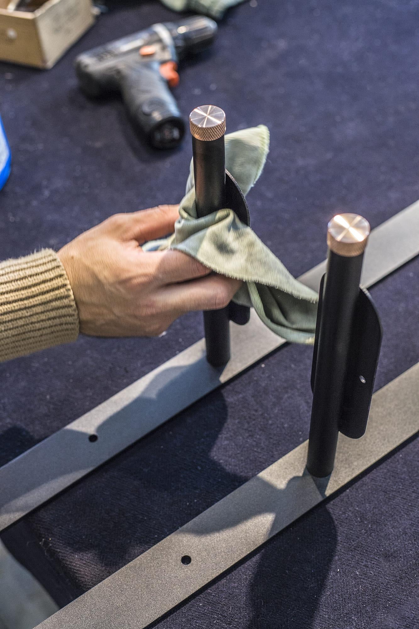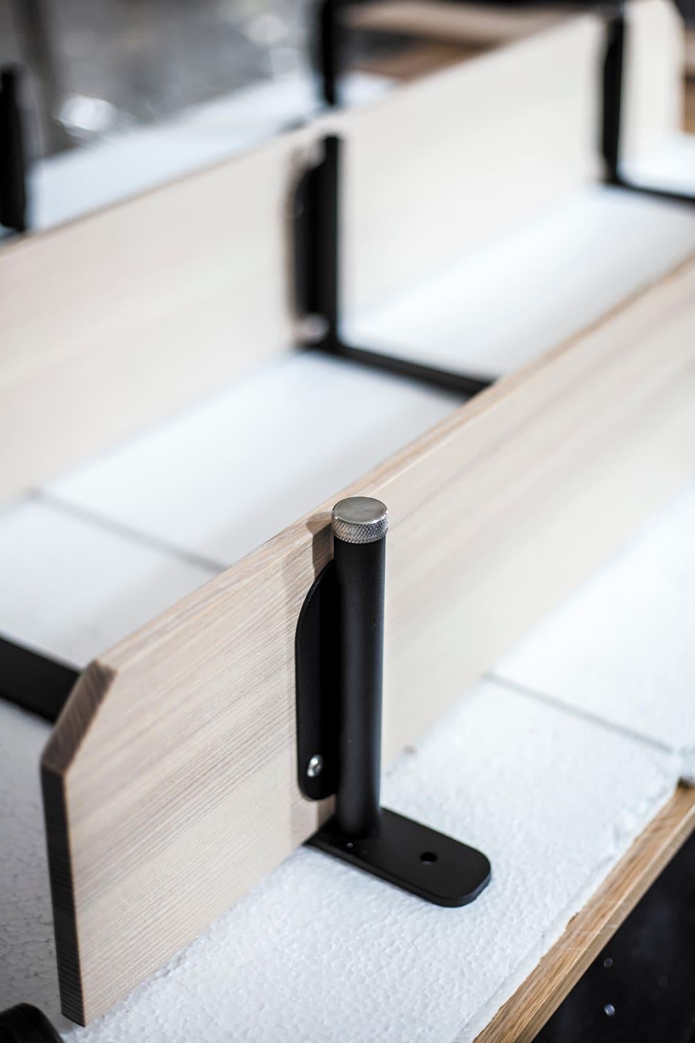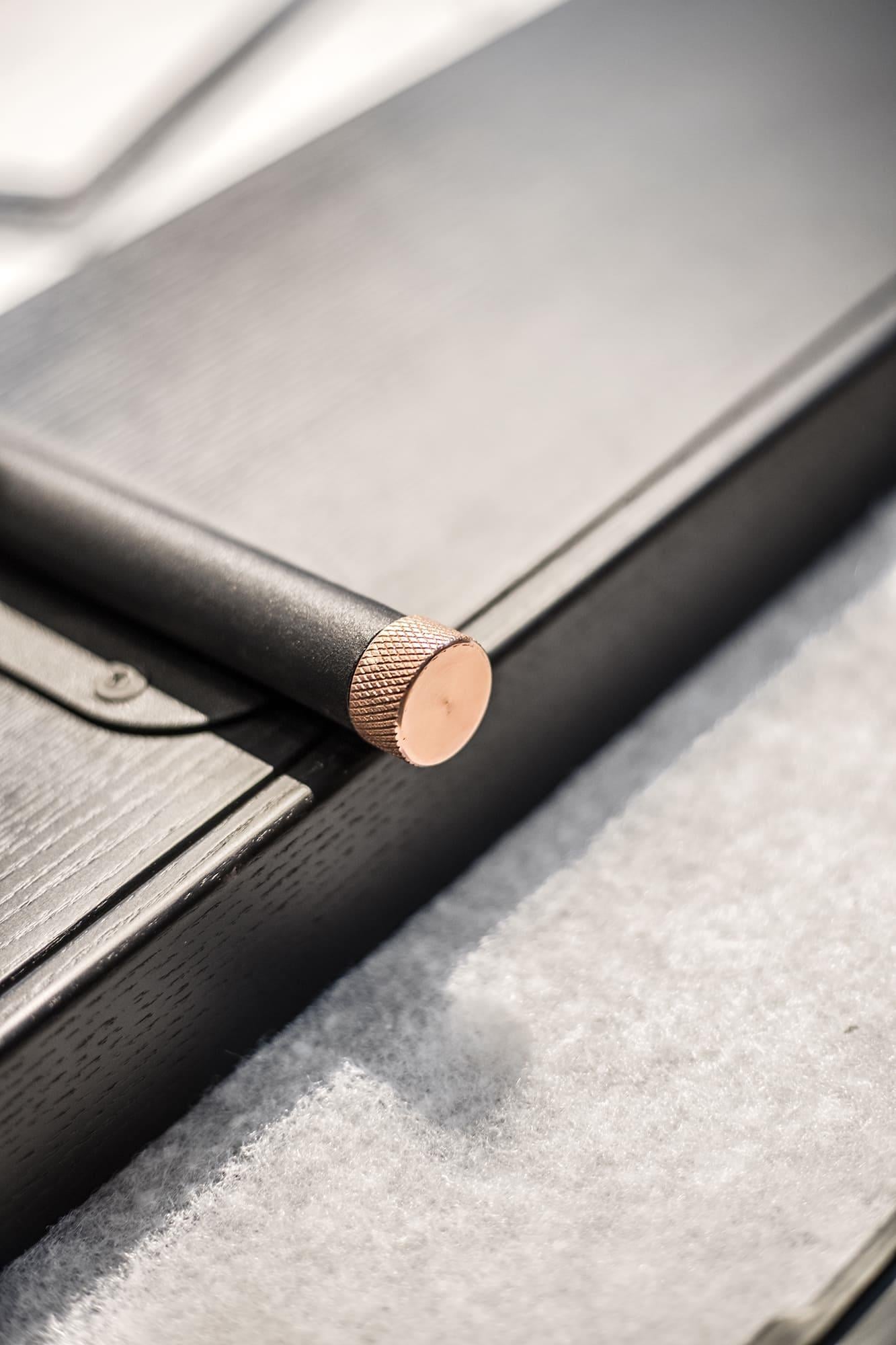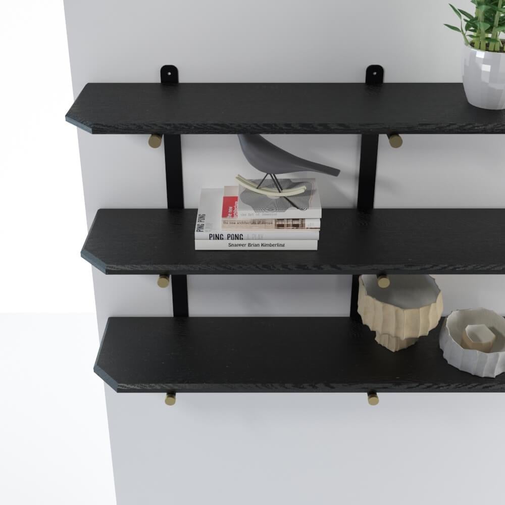 Яскравою особливістю поличок є акцентні латунні закінчення. У поєднанні з темною дерев'яною поверхнею, вони створюють відчуття блискучих ґудзиків на японській шкільній формі для хлопчиків - гакуран. Як ще одне відсилання до освіти і до того, що часи суворої шкільної дисципліни для вас уже минули. Tsunde будуть доречні в різних домашніх зонах: коридорі, передпокої, вітальні, спальні або кухні. Потужні кронштейни зі сталевого листа і труби, створюють міцну систему, що кріпиться до стіни. Це дає змогу скласти підвісні книжкові шафи в громадських просторах і освітніх центрах.