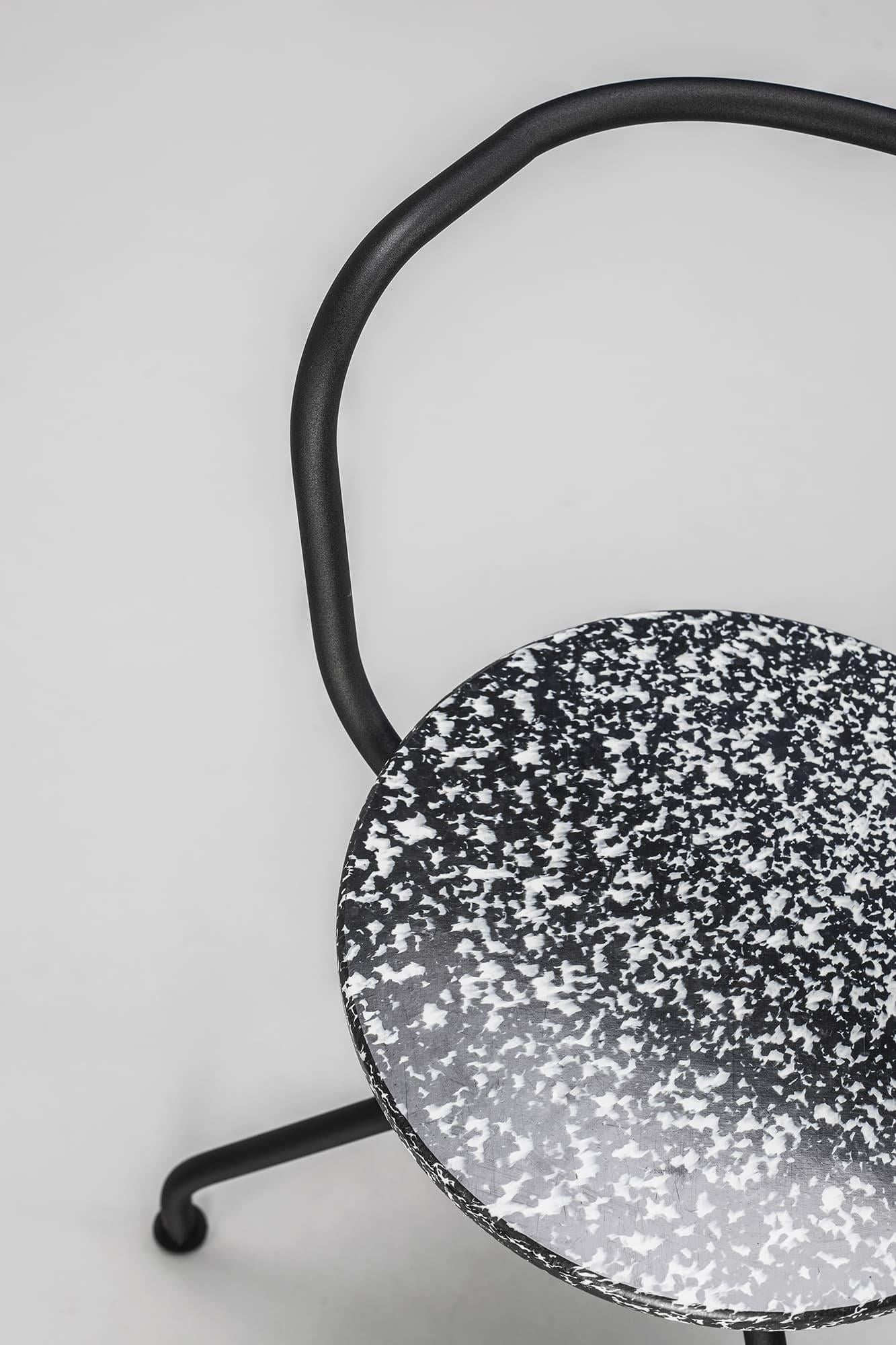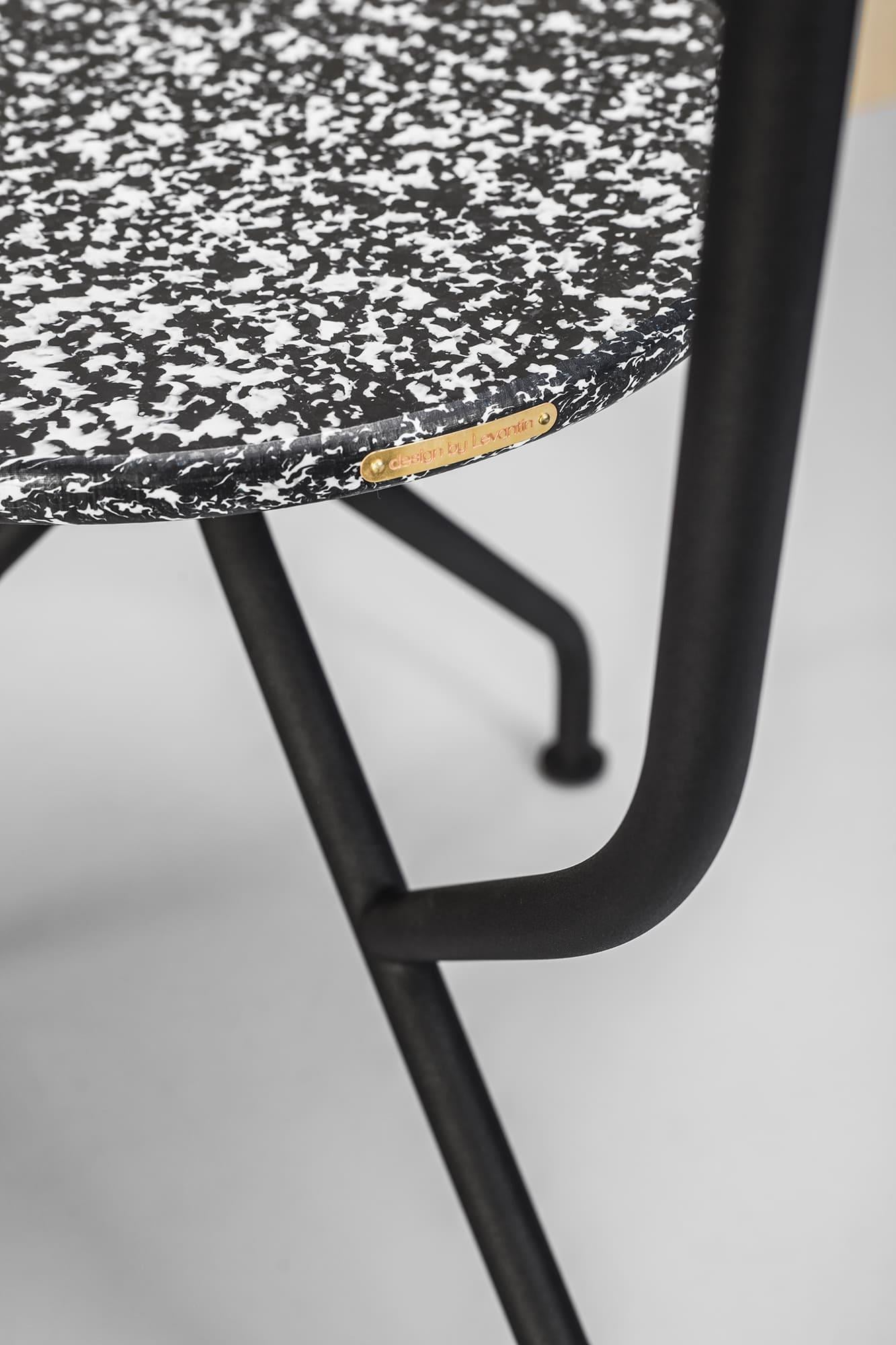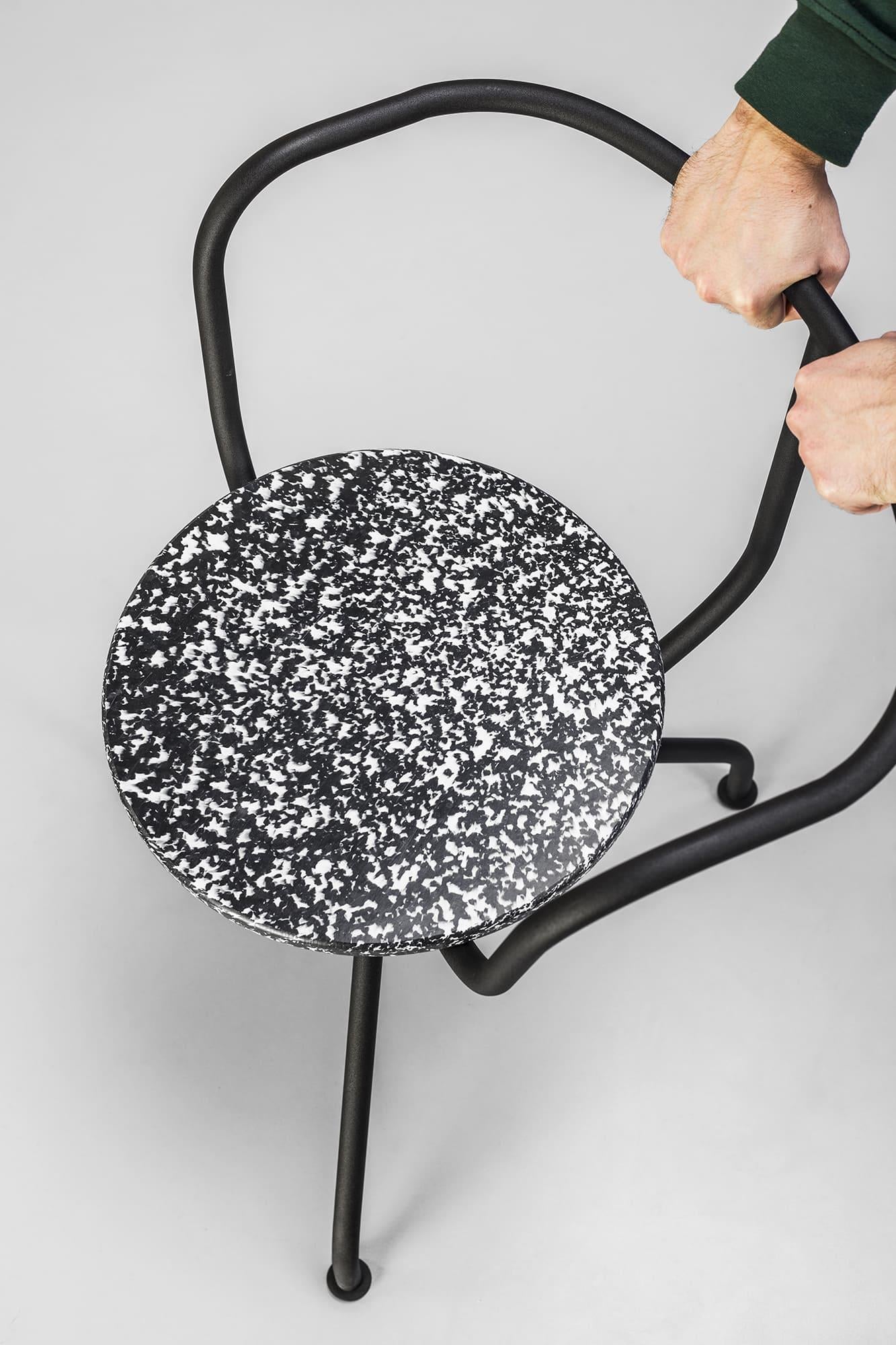 Сиденье из переработанного пластика создала для нас одесская мастерская Precious plastic Ukraine. Полотно толщиной 20 мм сделано из вторичного полиэтилена HDPE, сырьем для которого стали использованные белые и черные флаконы от шампуней. Это супер-материал не только благодаря вторичному использованию, но и в силу своих функциональных свойств: нетоксичен, устойчив к солнечному УФ-излучению, выдерживает низкие температуры, не боится воздействия воды, кислот, щелочей. Для его изготовления, для начала, флаконы собирают, промывают, сортируют и дробят специальными измельчителями. После чего нужные по цветам гранулы смешиваются и подвергается нагреванию и сжатию под давлением, получая ровную плиту. После того как пластик застыл, изделие нужной формы вырезается на ЧПУ станке, и, вуаля, сиденье готово!