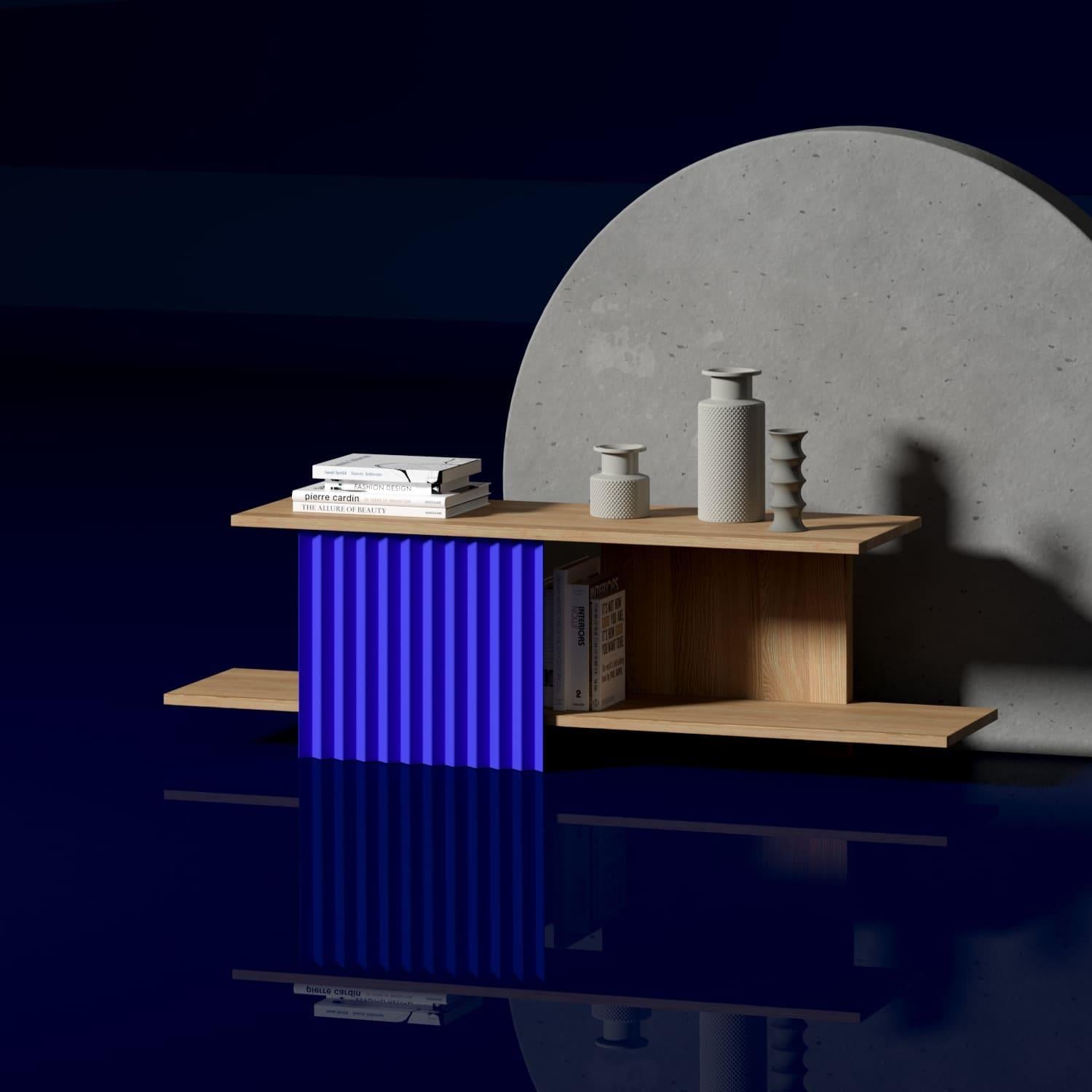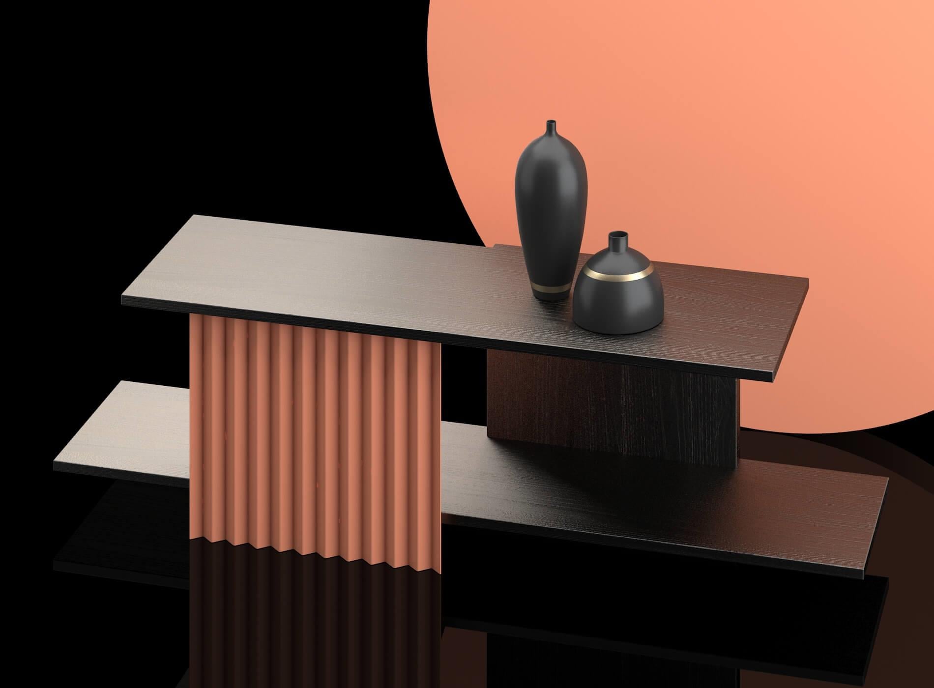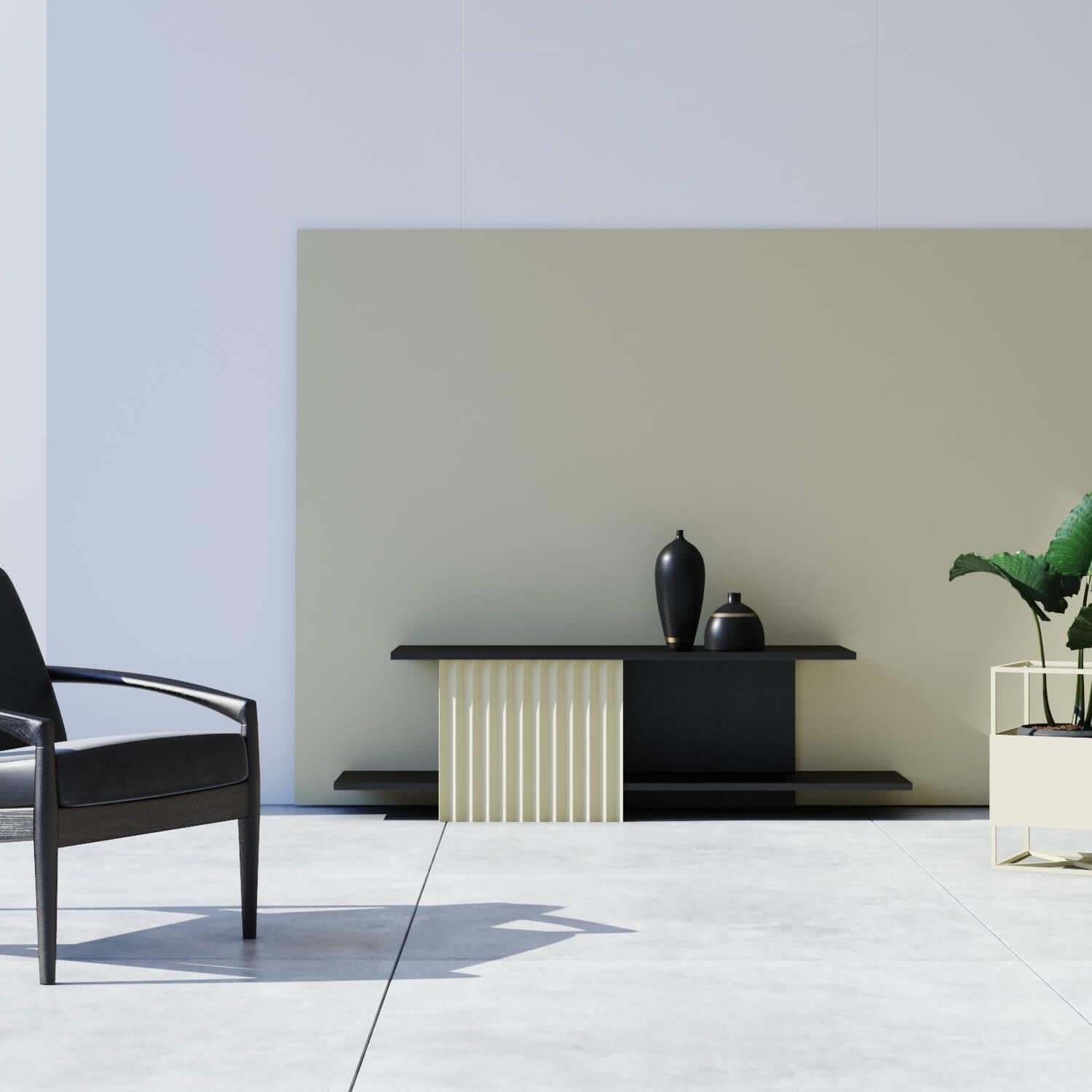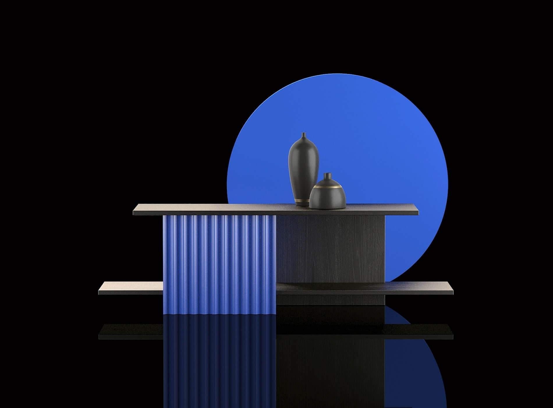 Исследуя искусство каменного века, мы интерпретировали зигзагообразный орнамент Древнего Китая «узоры грома» (лэй вэнь). Созданная из стали плиссировка придает тумбе визуальную фактуру и устойчивость. Однако её основное назначение осталось прежним, что и людей, расписывающих неолитическую керамику три тысячи лет назад, — из желания украшать поверхности, окружая себя красивыми вещами.