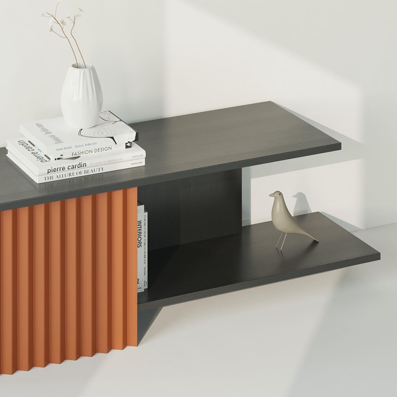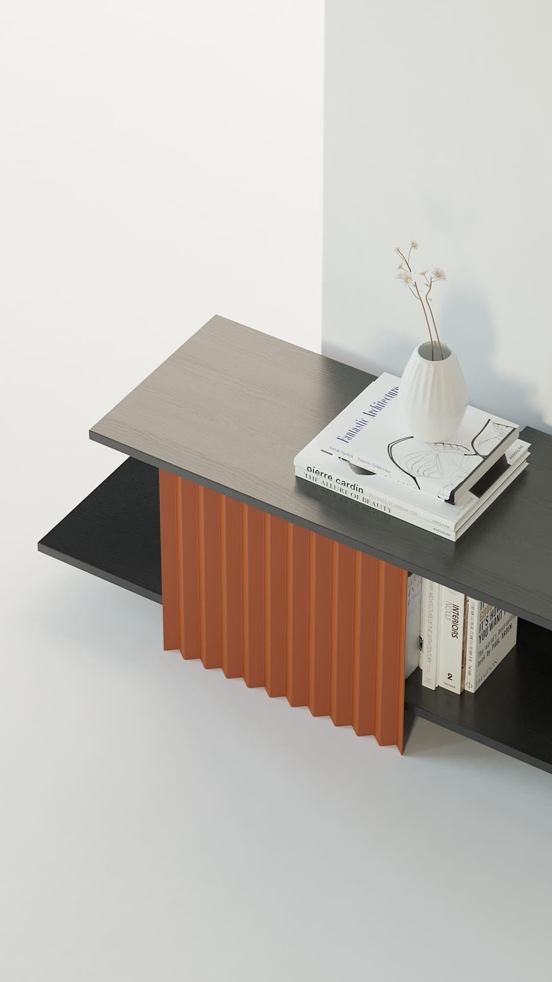 Тумба Leiwen — это функциональное место хранения с эстетичным дизайном. Её внешний вид олицетворяет монолитность и естественность деревянных поверхностей. Их симметрия создает стабильность, при этом определенные ракурсы демонстрируют обманчивую иллюзию левитации. Композиция элементов конструкции Leiwen сложена на манер китайских иероглифов. Этому вторит и акцентный фасад из металлического листа, сложенный гармоникой.